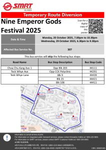 Bus Service 307 will be diverted on Monday 20 October 2025 & Wednesday 29 October 2025 for the Nine Emperor Gods Festival 2025.