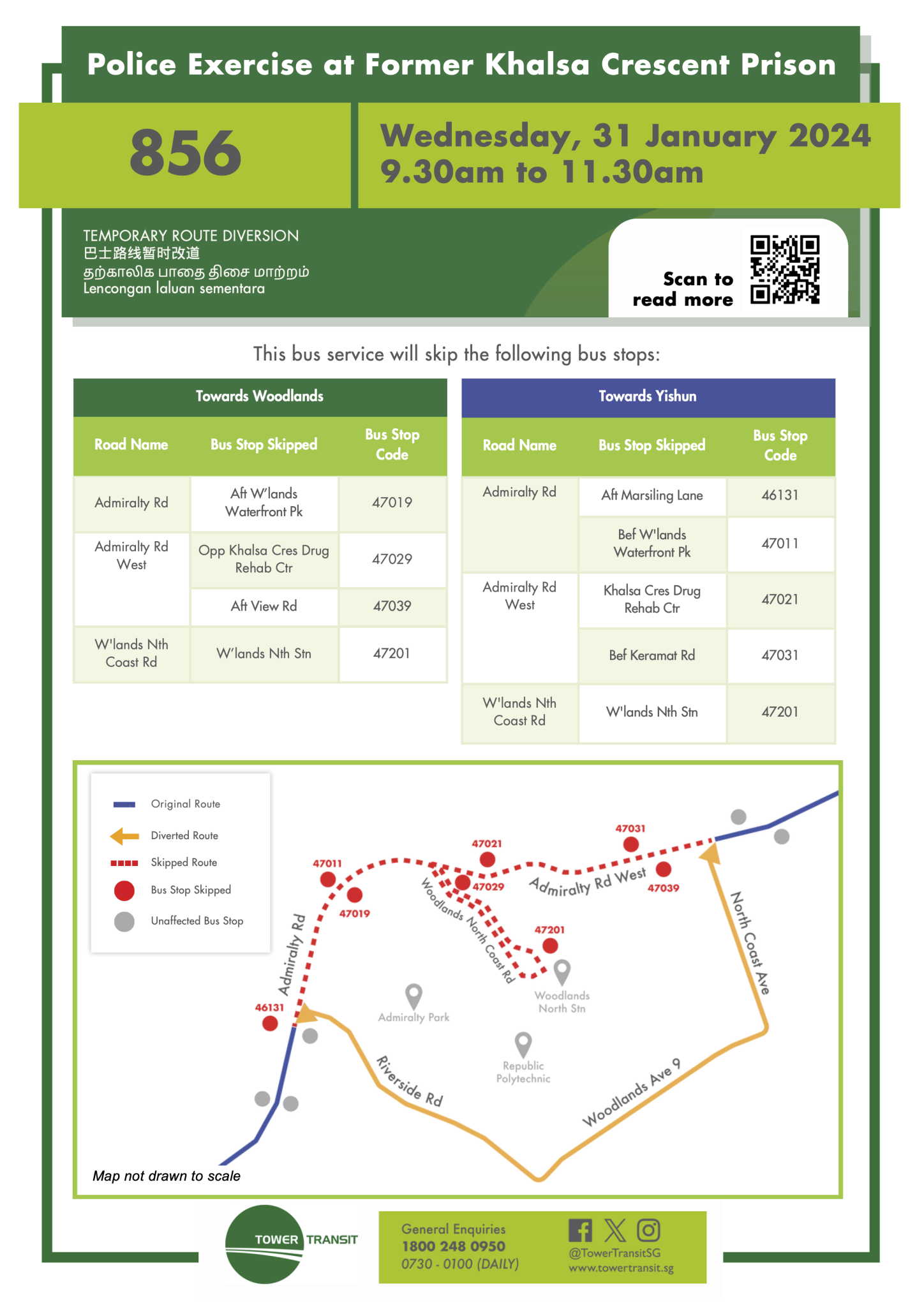 Bus Service 856 plying along Admiralty Road West will be affected by a Police Exercise at the former Khalsa Crescent Prison.
