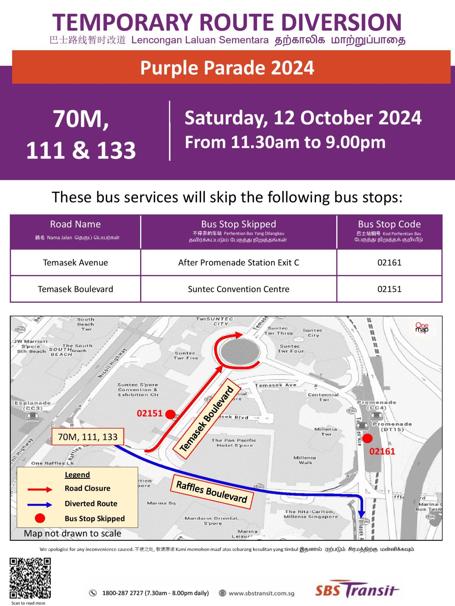Various bus services in the Suntec City area will be diverted on Saturday, 12 October 2024 for the Purple Parade 2024.