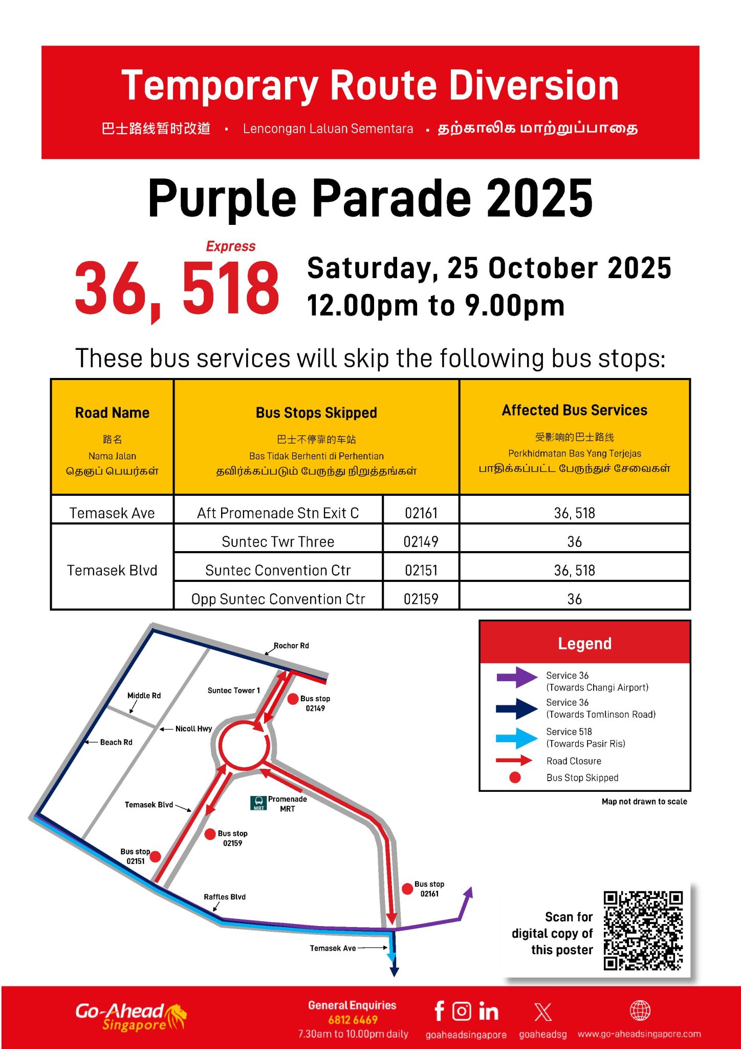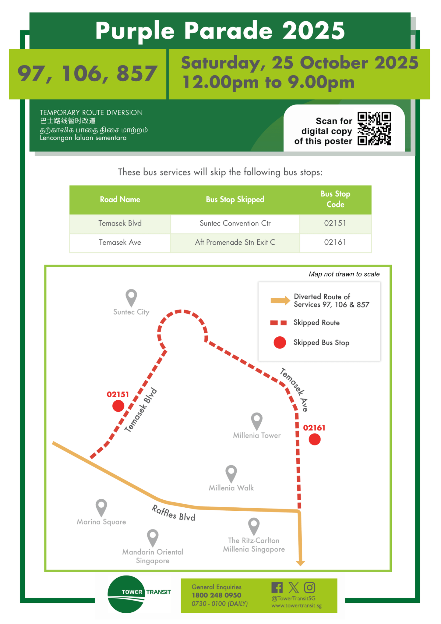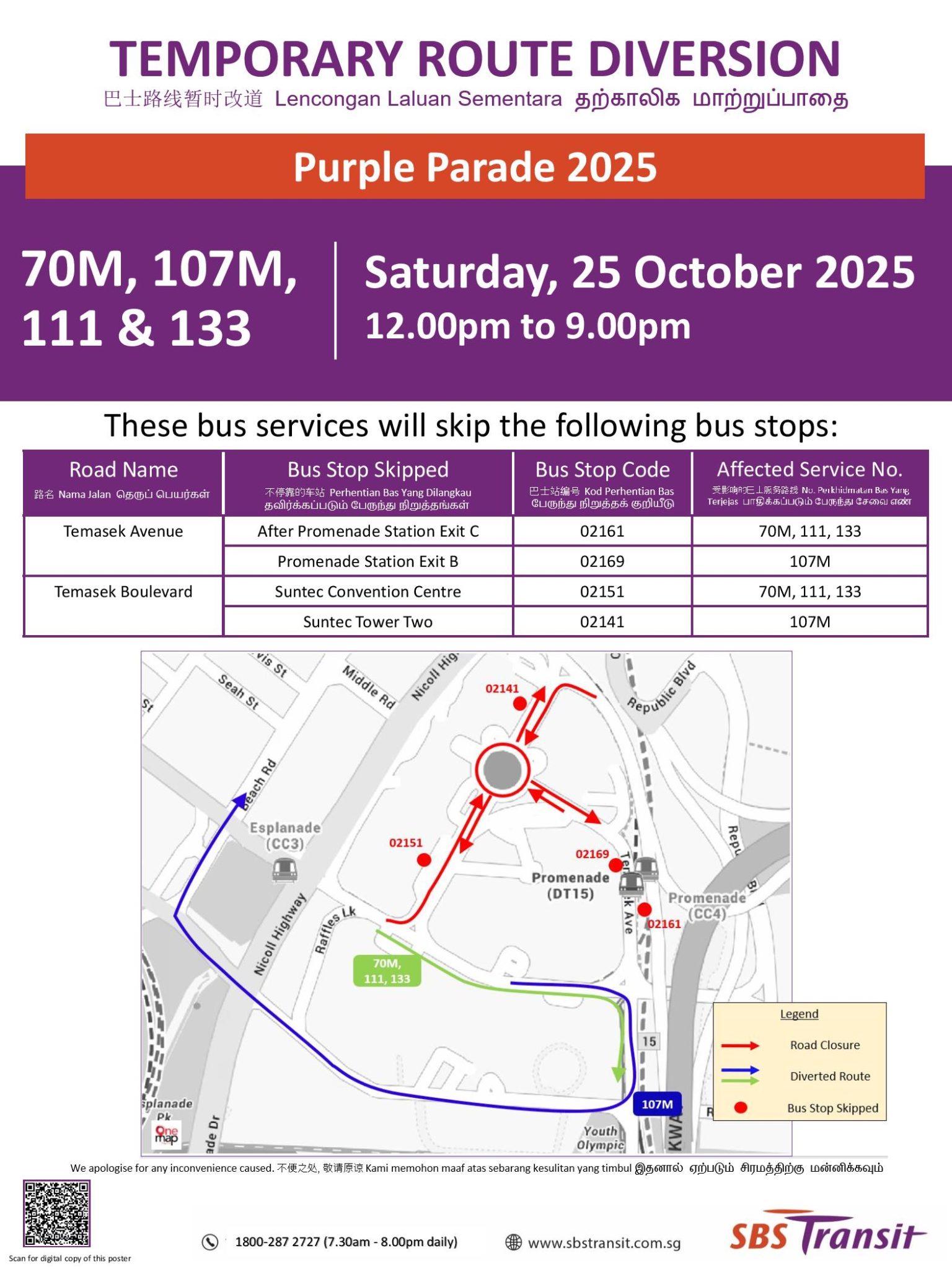 Various bus services in the Suntec City area will be diverted on Saturday, 25 October 2025 for the Purple Parade 2025.