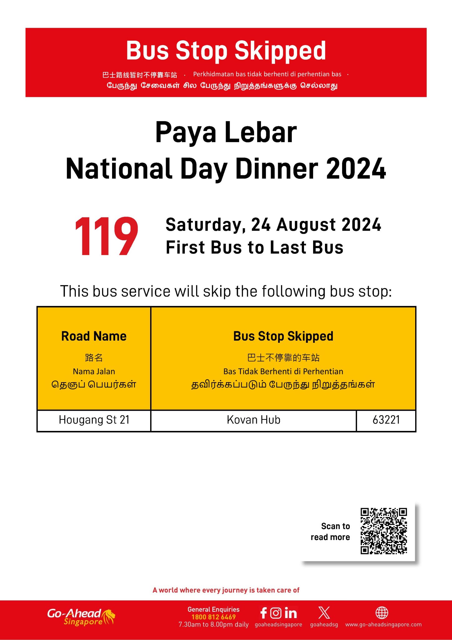 | Bus Stop Skipped for Paya Lebar National Day Dinner 2024 Saturday, 24 August 2024 First Bus – Last Bus |