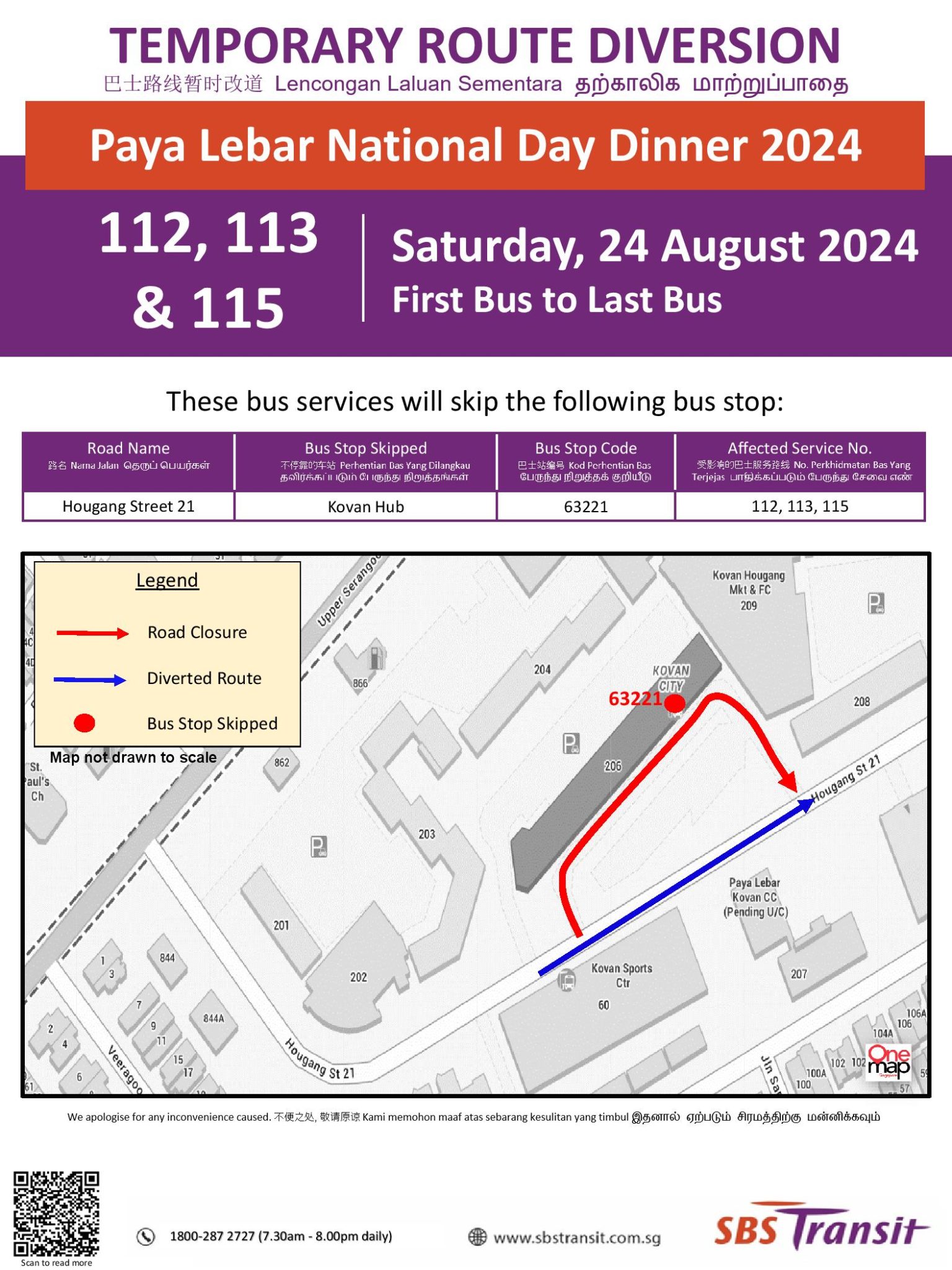 Bus Services serving Kovan Hub along Hougang Street 21 will be diverted on Saturday, 24 August 2024 for Paya Lebar National Day Dinner 2024.