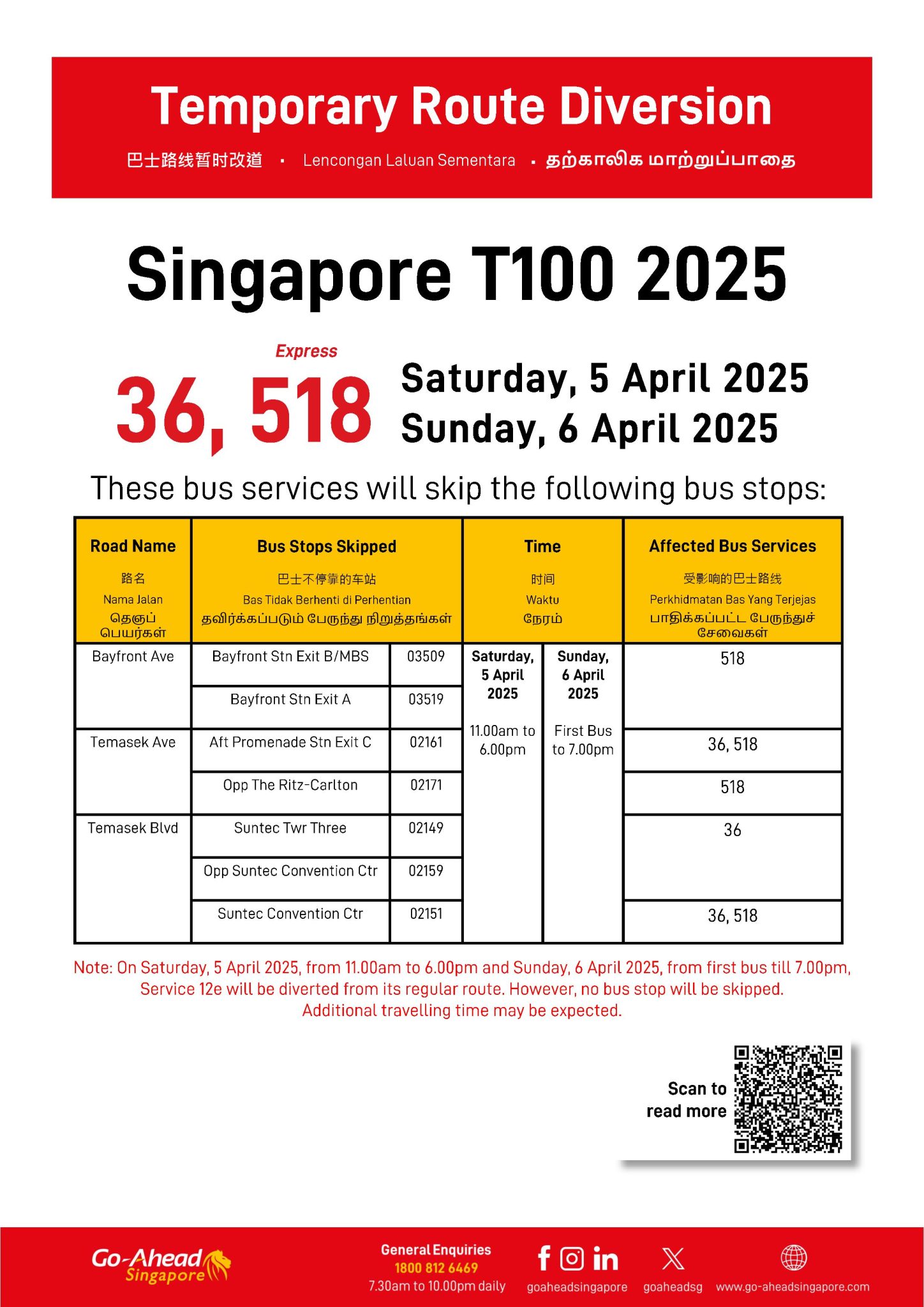 Road and lane closures for the Singapore T100 2025 will affect bus services in the city area.