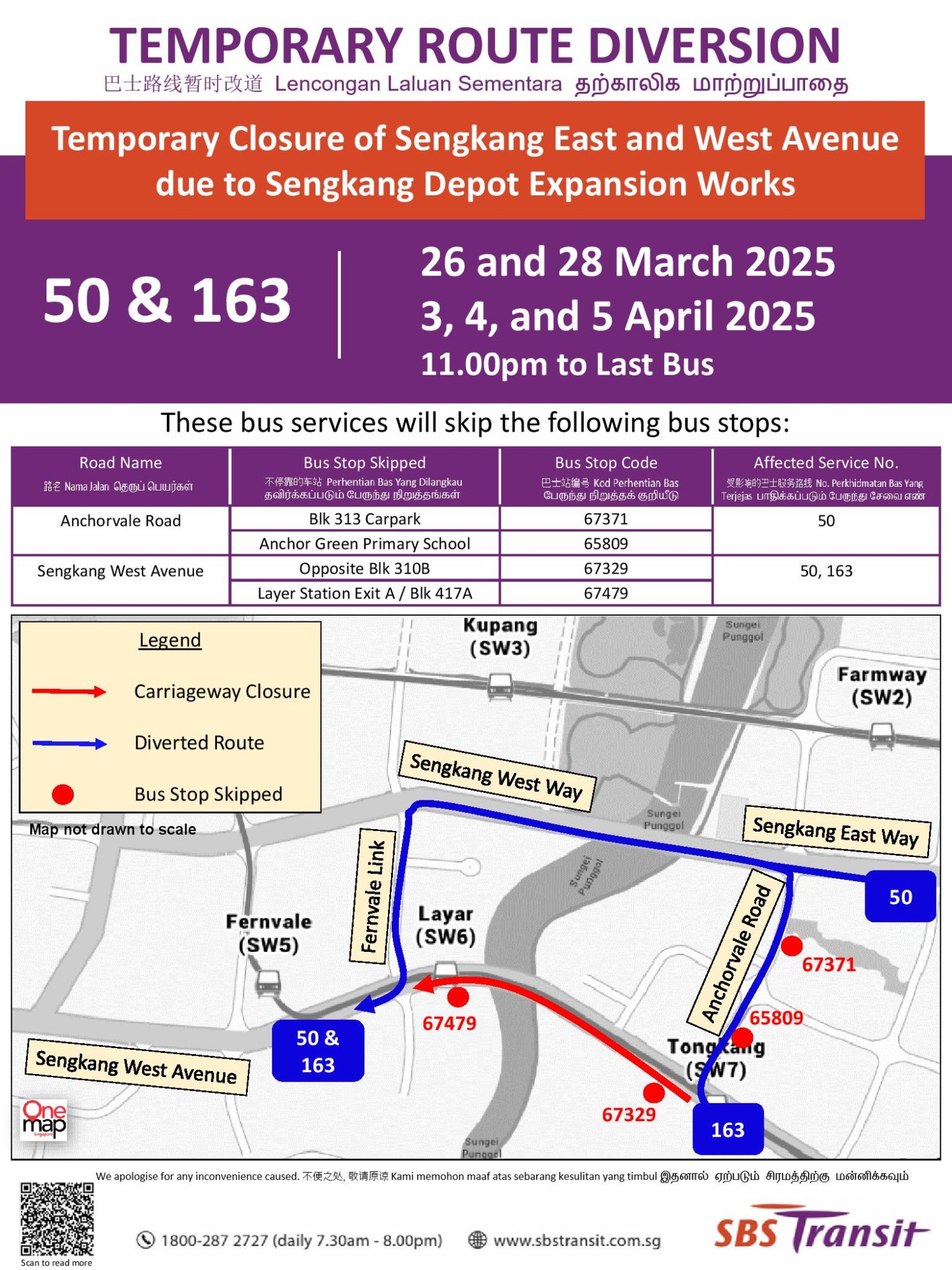 Note: Diversions for April 2025 cancelled based on bus stop skipped poster at affected bus stops (affected dates in April 2025 taped over).