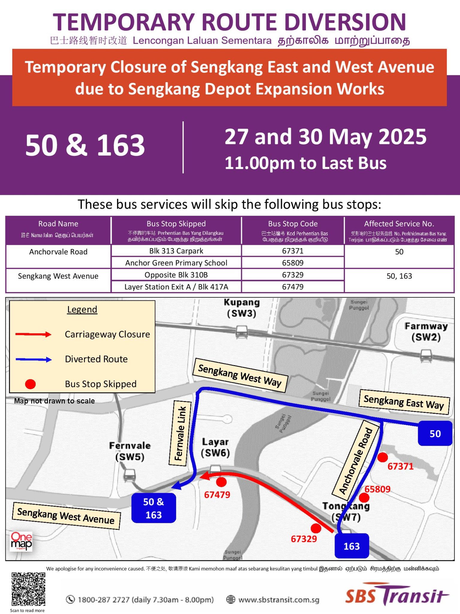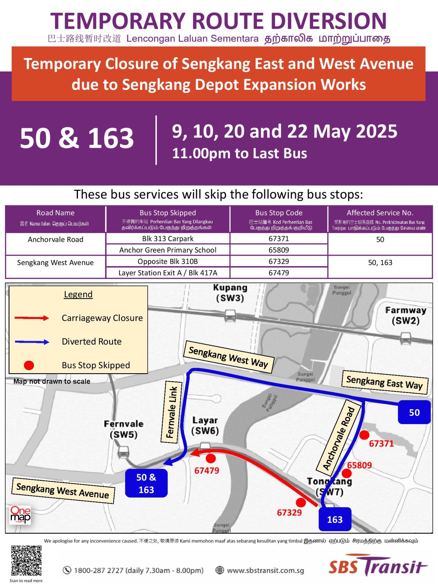 | Bus Stops Skipped for Temporary Closure of Sengkang East & West Avenue due to Sengkang Depot Expansion Works Friday, 9 May 2025 Saturday, 10 May 2025 Tuesday, 20 May 2025 Thursday, 22 May 2025 Tuesday, 27 May 2025 Friday, 30 May 2025 11.00pm – Last Bus |