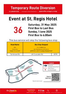 Bus Service 36 will be diverted due to an event at St. Regis Hotel.