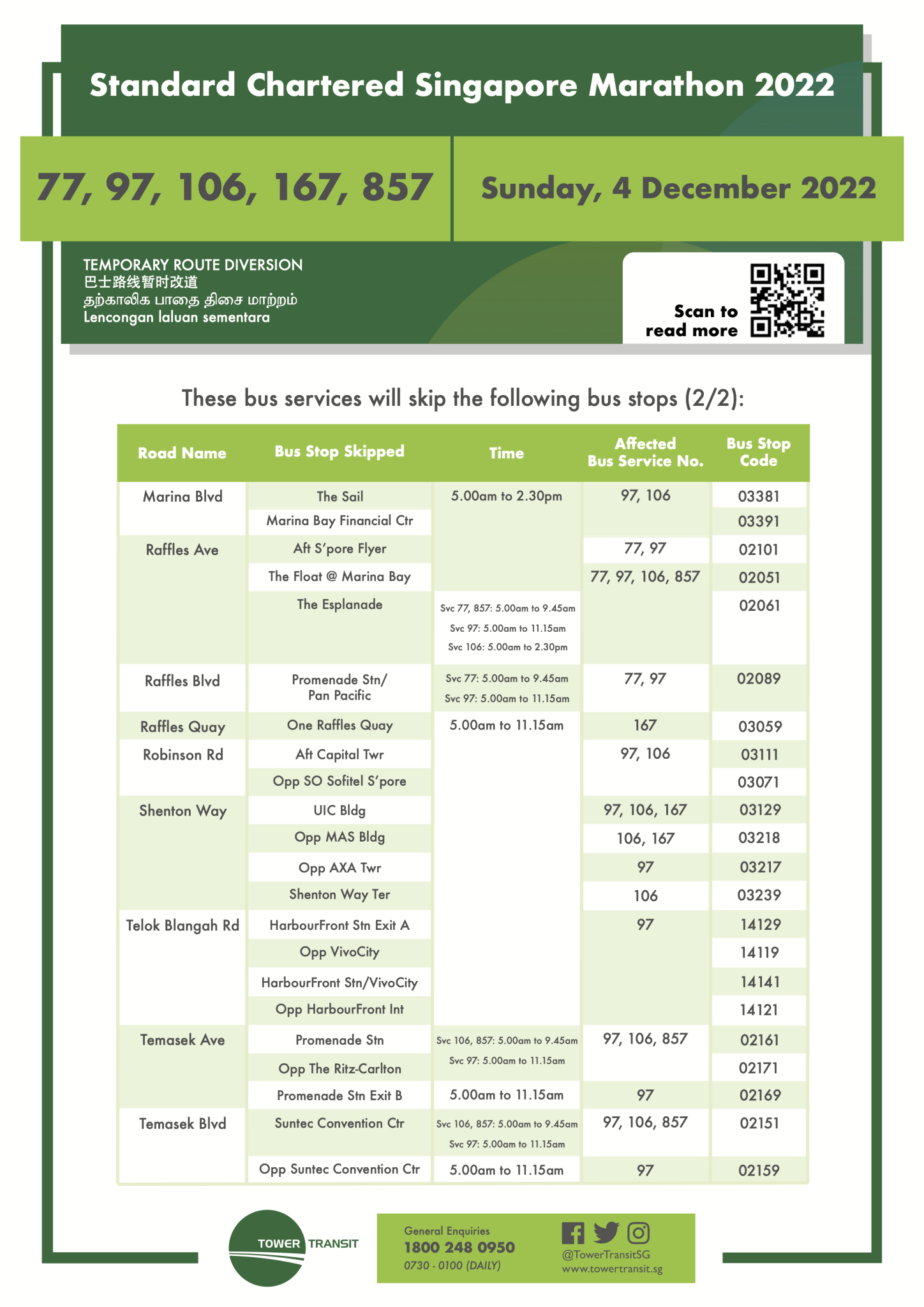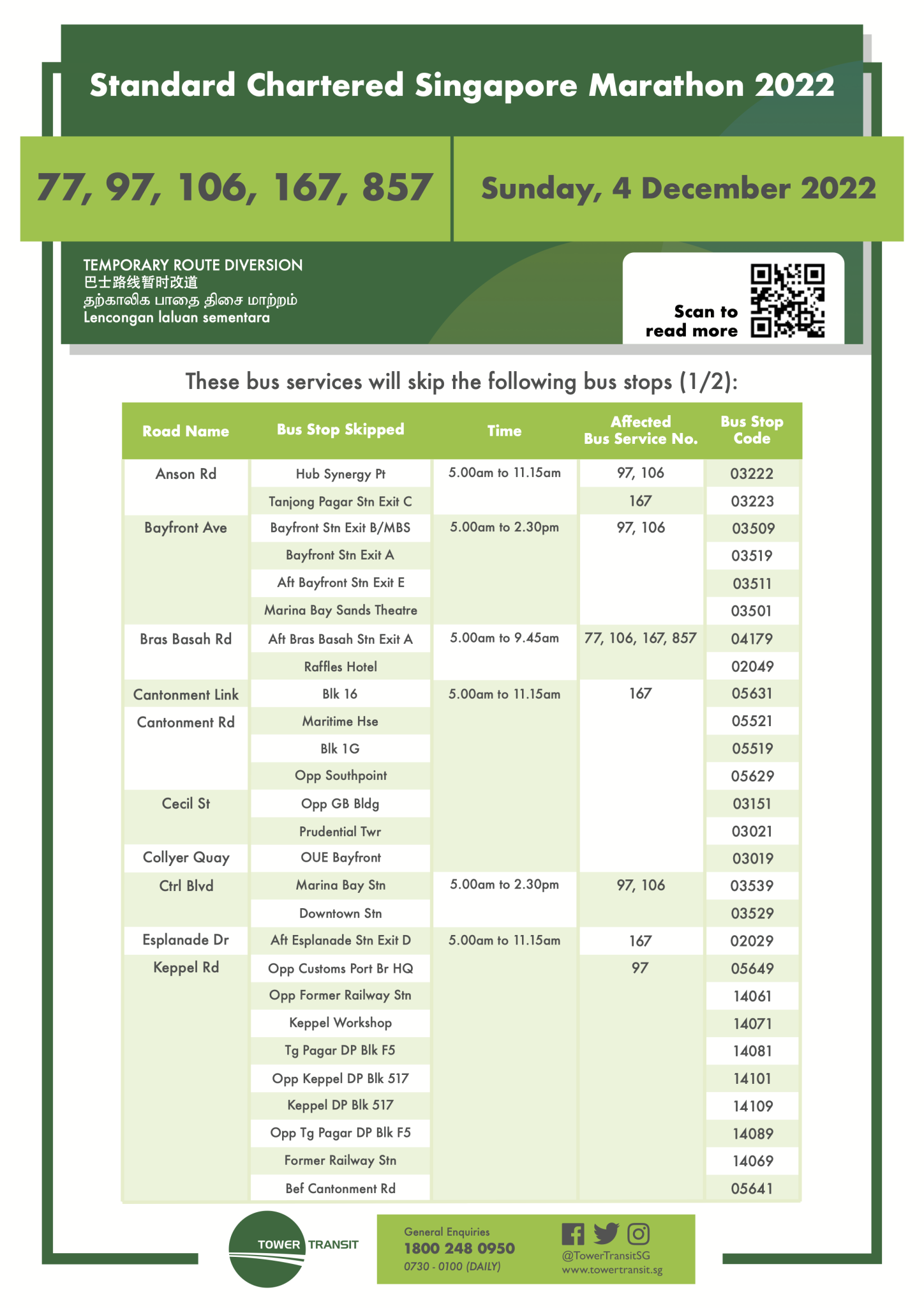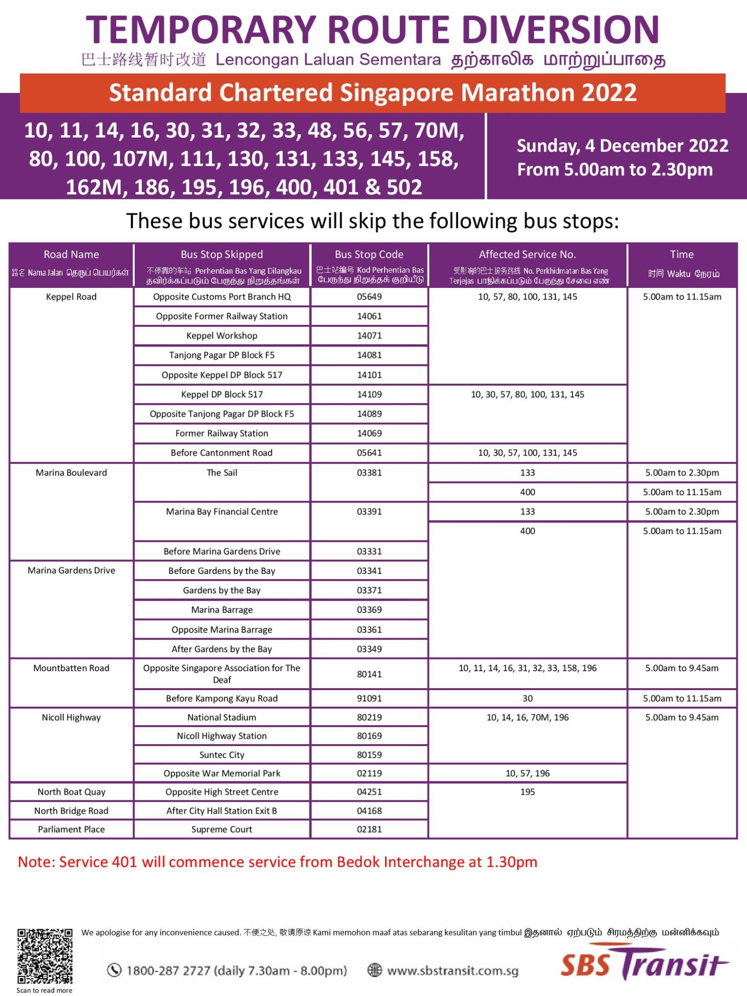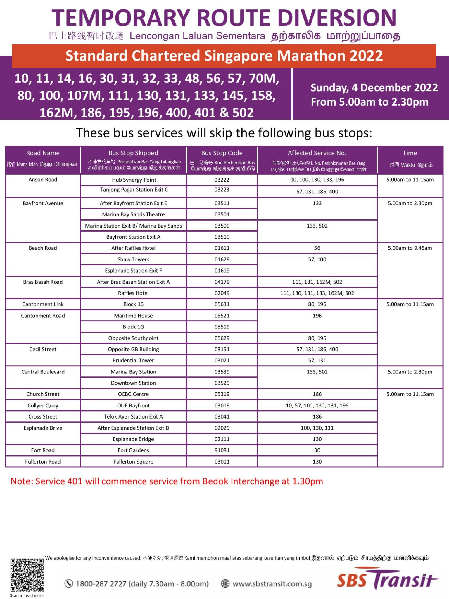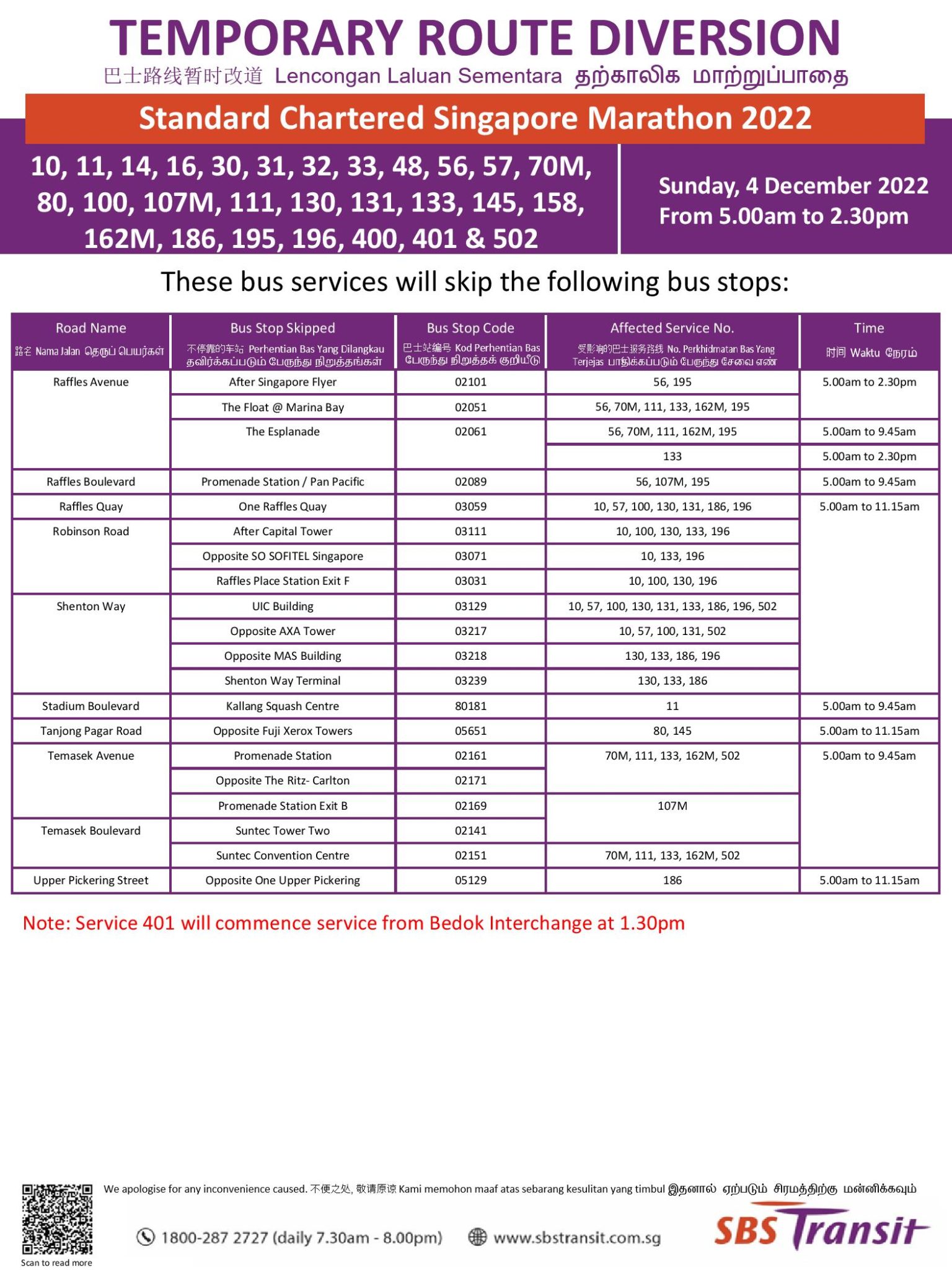 | Bus Stops Skipped for Standard Chartered Singapore Marathon 2022 Sunday, 4 December 2022 5:00am – 2:30pm |