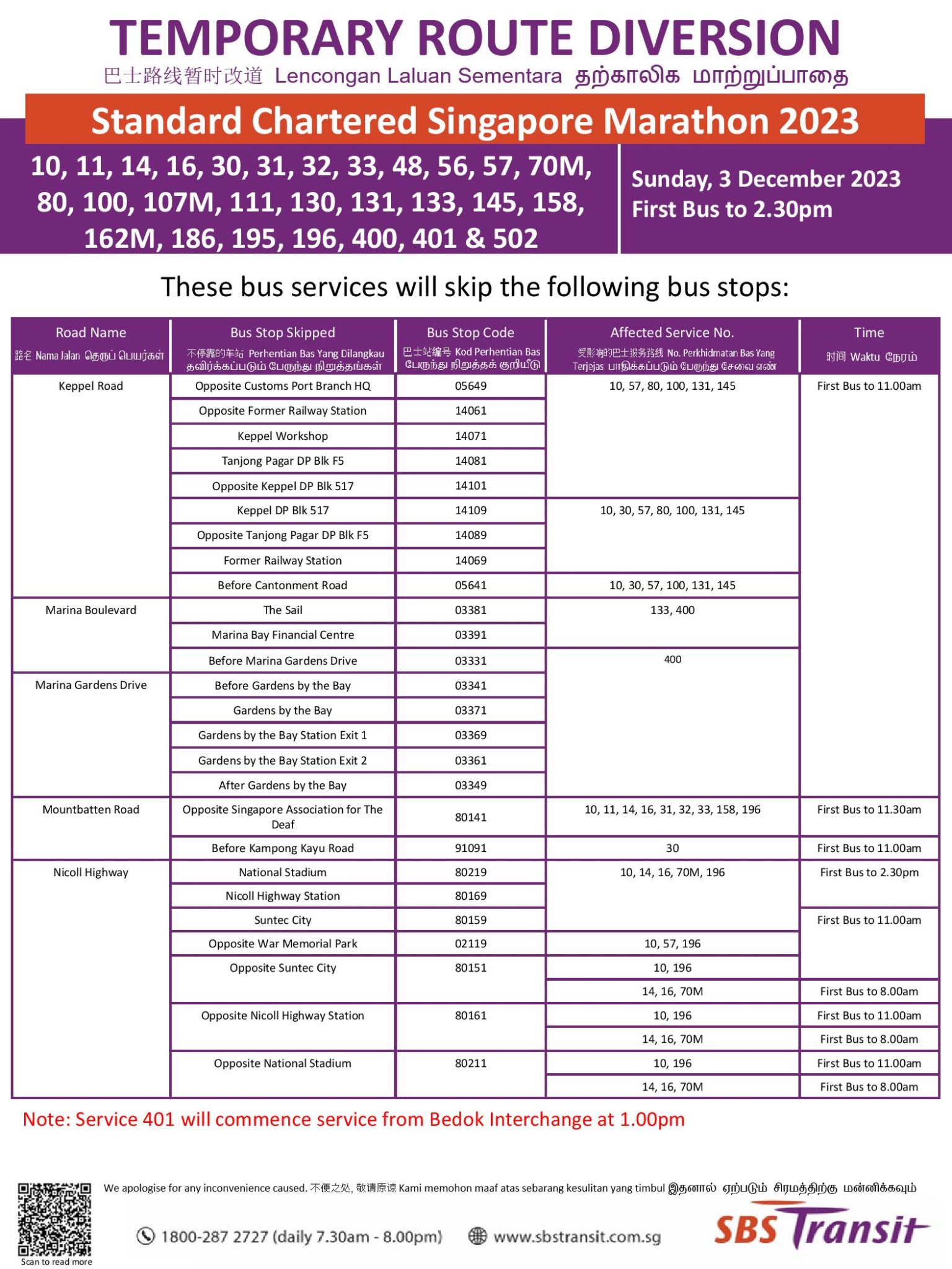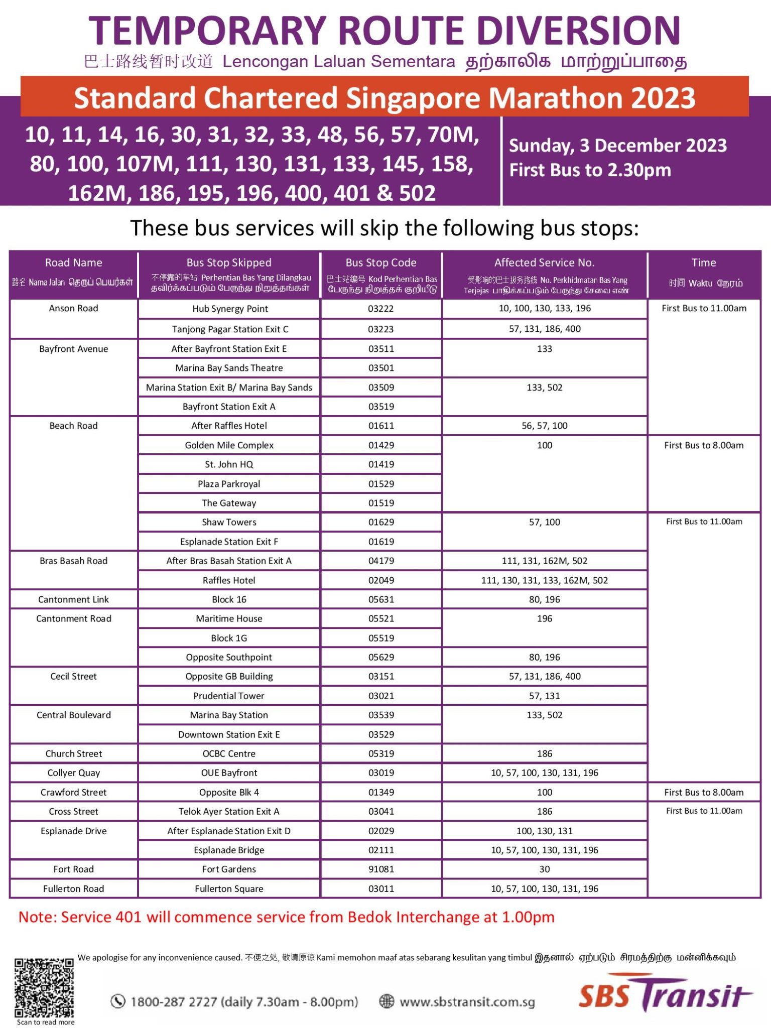 Bus Service Diversion for Standard Chartered Singapore Marathon 2023 (3 Dec)