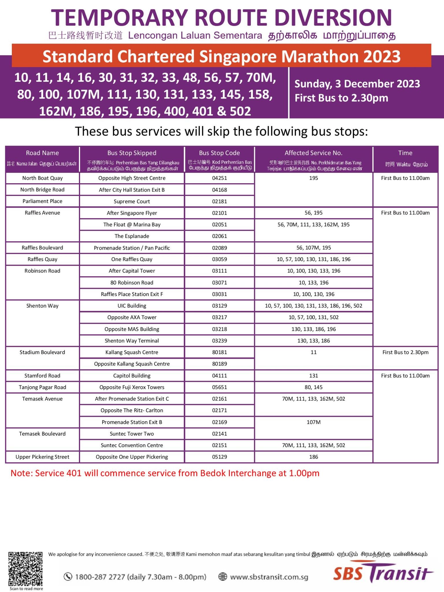 | Bus Stops Skipped for Standard Chartered Singapore Marathon 2023 Sunday, 3 December 2023 First Bus – 2:30pm |