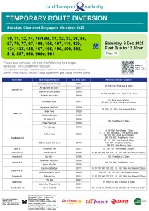 Road and lane closures for the Standard Chartered Singapore Marathon 2025 on Saturday 6 December 2025 & Sunday 7 December 2025 will affect bus services in the city area.