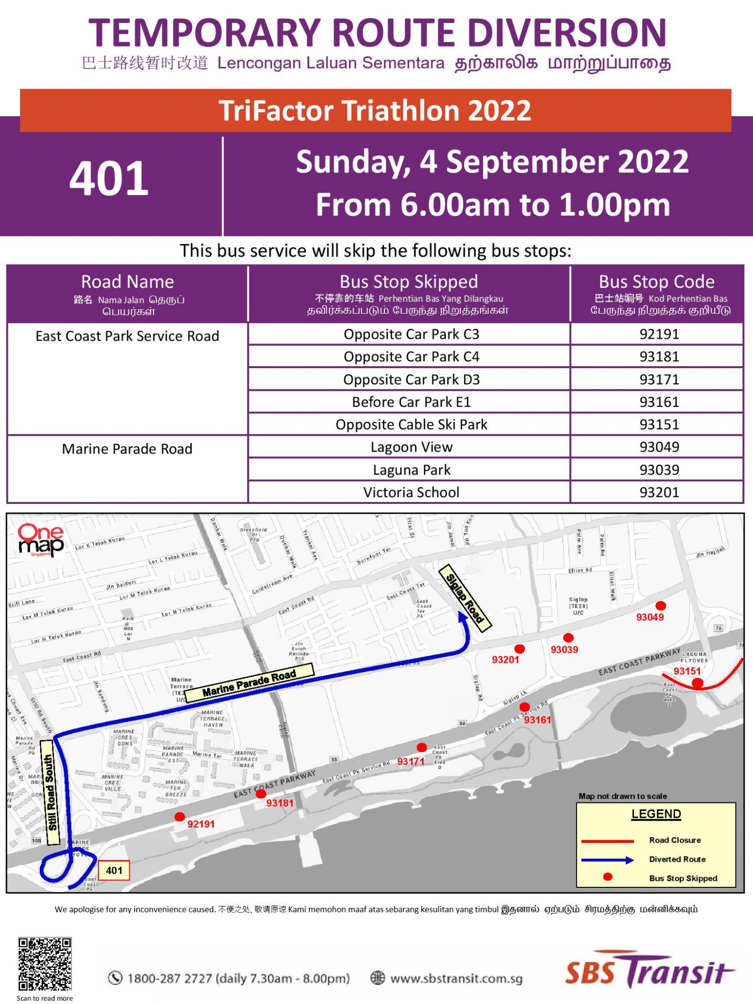 Bus Service 401 will be diverted on Sunday, 4 September 2022 for TriFactor Triathlon 2022.