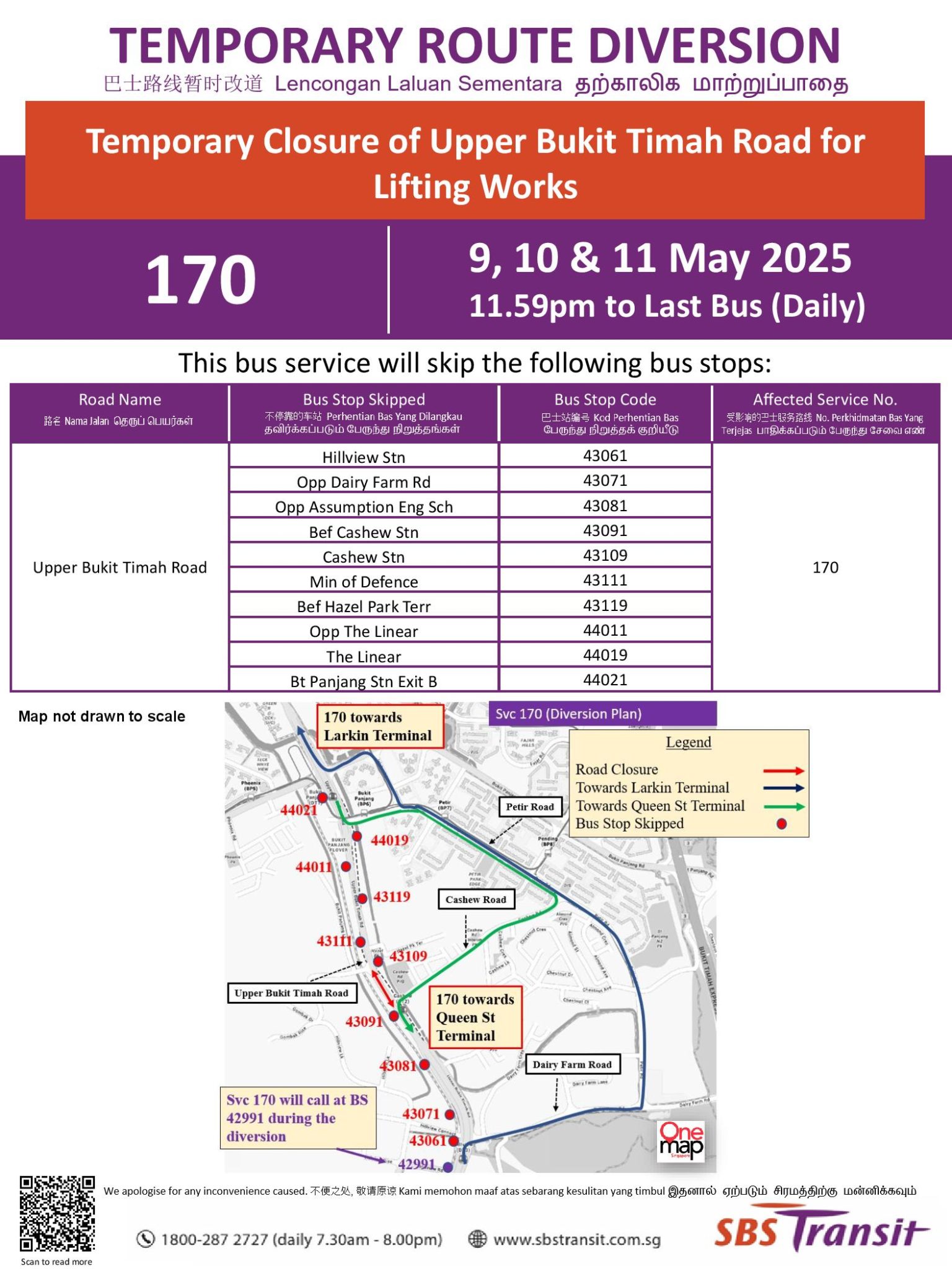 Bus Service Diversion for Temporary Closure of Upp Bt Timah Rd for Lifting Works (May 2025)