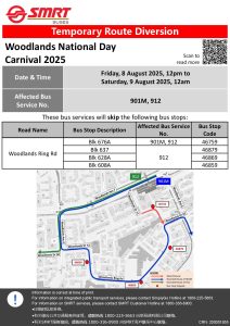 | Bus Stops Skipped for Woodlands National Day Carnival 2025 Friday, 8 August 2025 12:00pm – Saturday, 9 August 2025 12:00am |