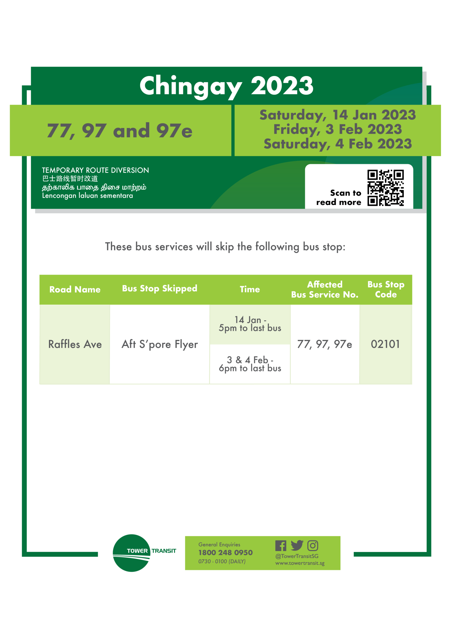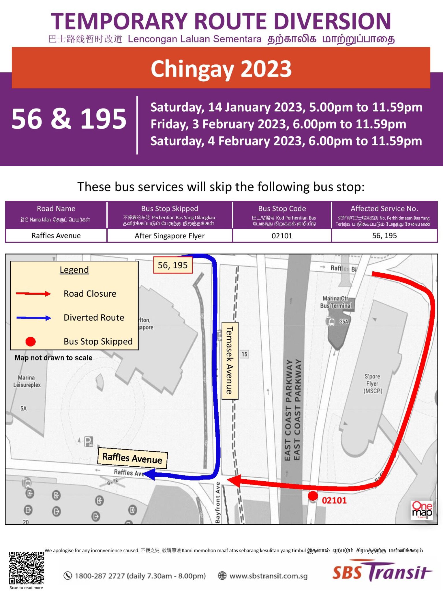 | Bus Stop Skipped for Chingay 2023 (NE Show) Friday, 3 February 2023 & Saturday, 4 February 2023 6.00pm – 11.59pm |