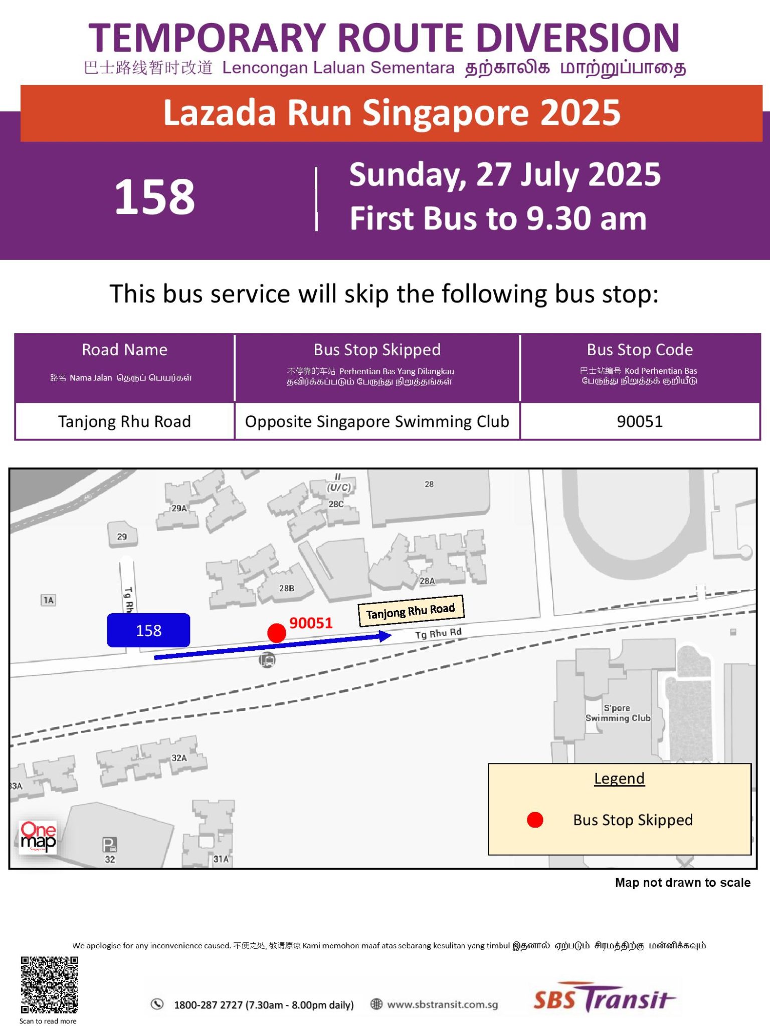 Service 158 will skip the bus stop opposite Singapore Swimming Club along Tanjong Rhu Rd due to the Lazada Run Singapore 2025.