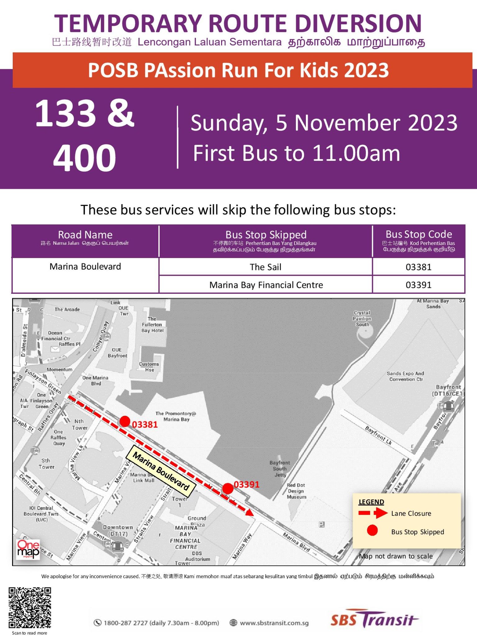 Bus services along Marina Blvd will be skip 2 bus stops on Sunday, 5 November 2023 for the POSB PAssion Run For Kids 2023