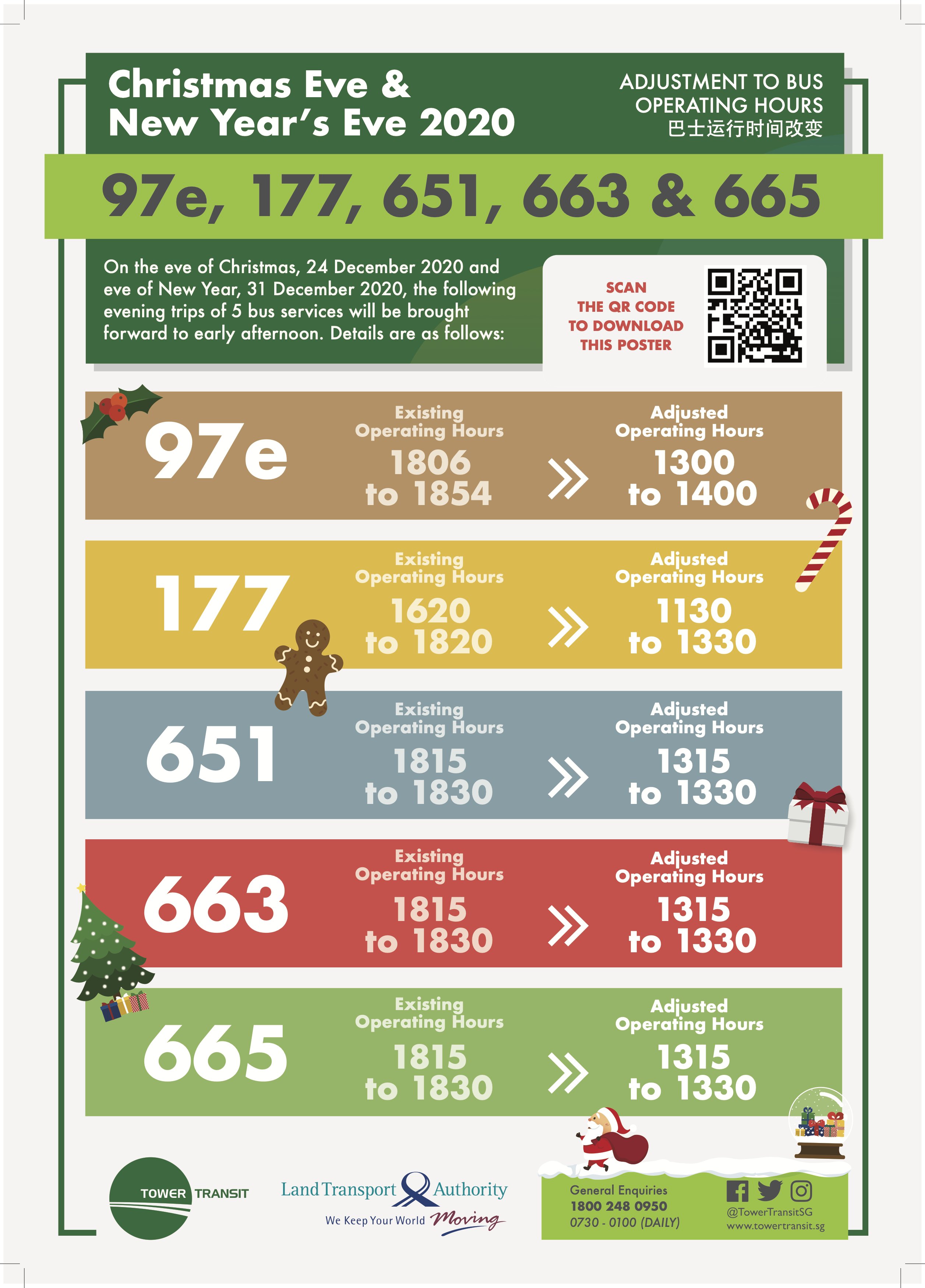 Operating hours for selected bus services will be adjusted on Christmas Eve, Thursday, 24 December 2020, for the benefit of commuters whose working hours are changed. Several evening peak bus services will operate in the early afternoon instead.