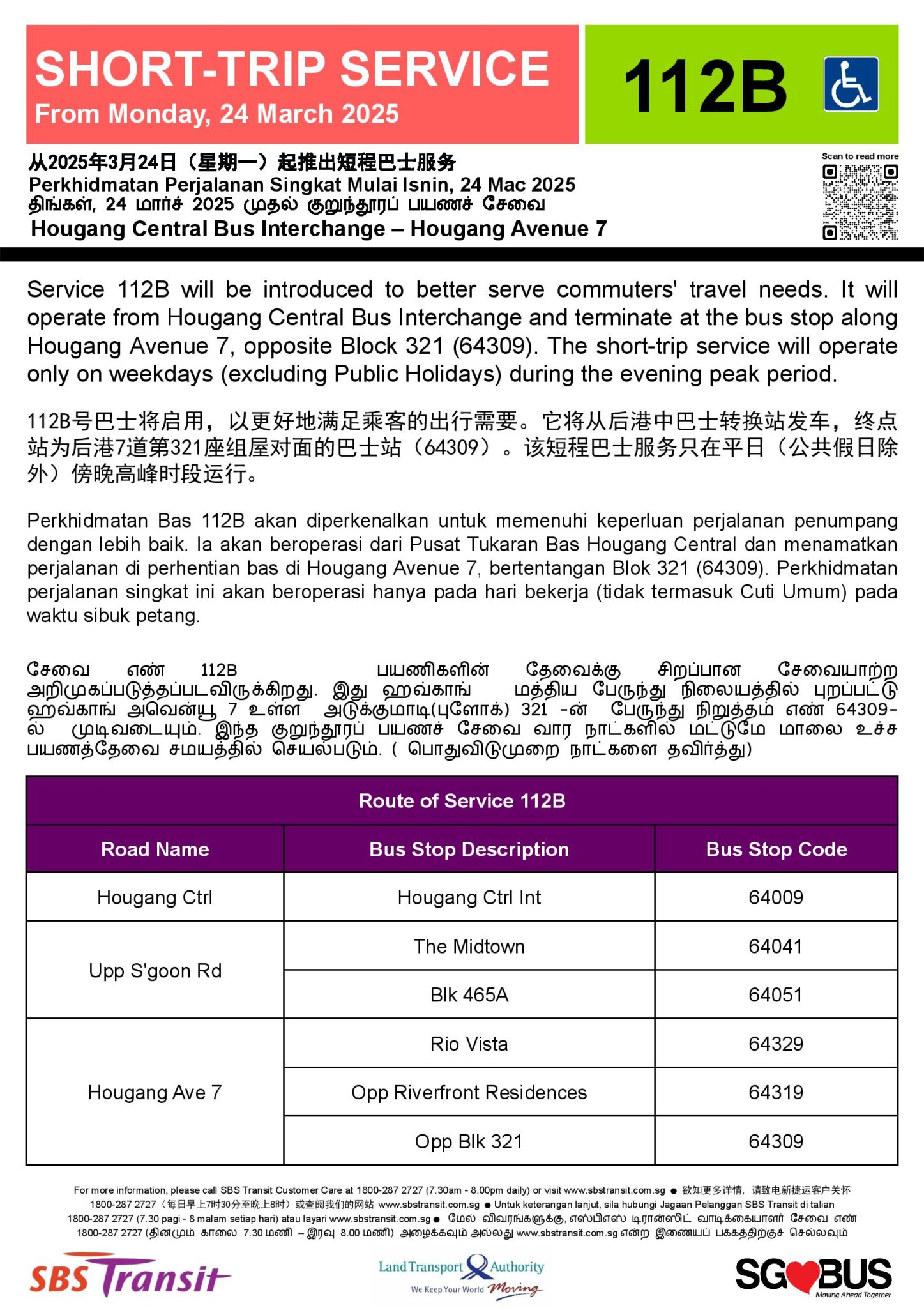 Service 112B is a Short Trip Service from Hougang Central Bus Interchange and ends at Hougang Avenue 7 (Opp Blk 321) during weekday evening peak hours (17:38 – 19:13), excluding Public Holidays.