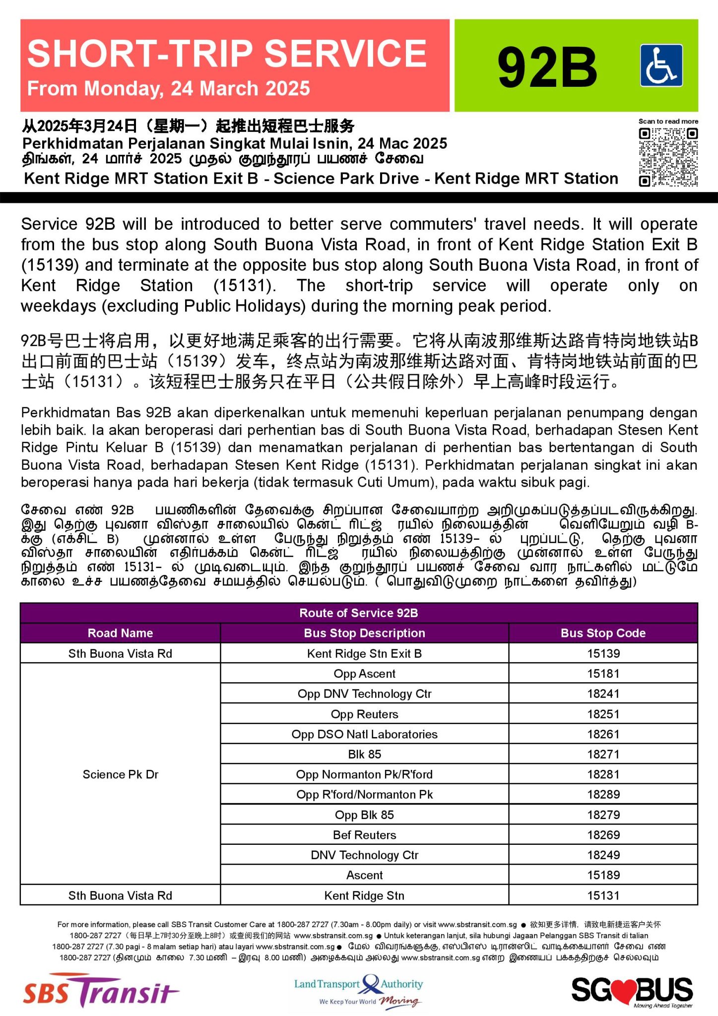 Service 92B operates from Kent Ridge MRT Station and loops at Science Park Drive, operating only during the weekday morning peak hours (07:50 – 09:11), excluding Public Holidays.