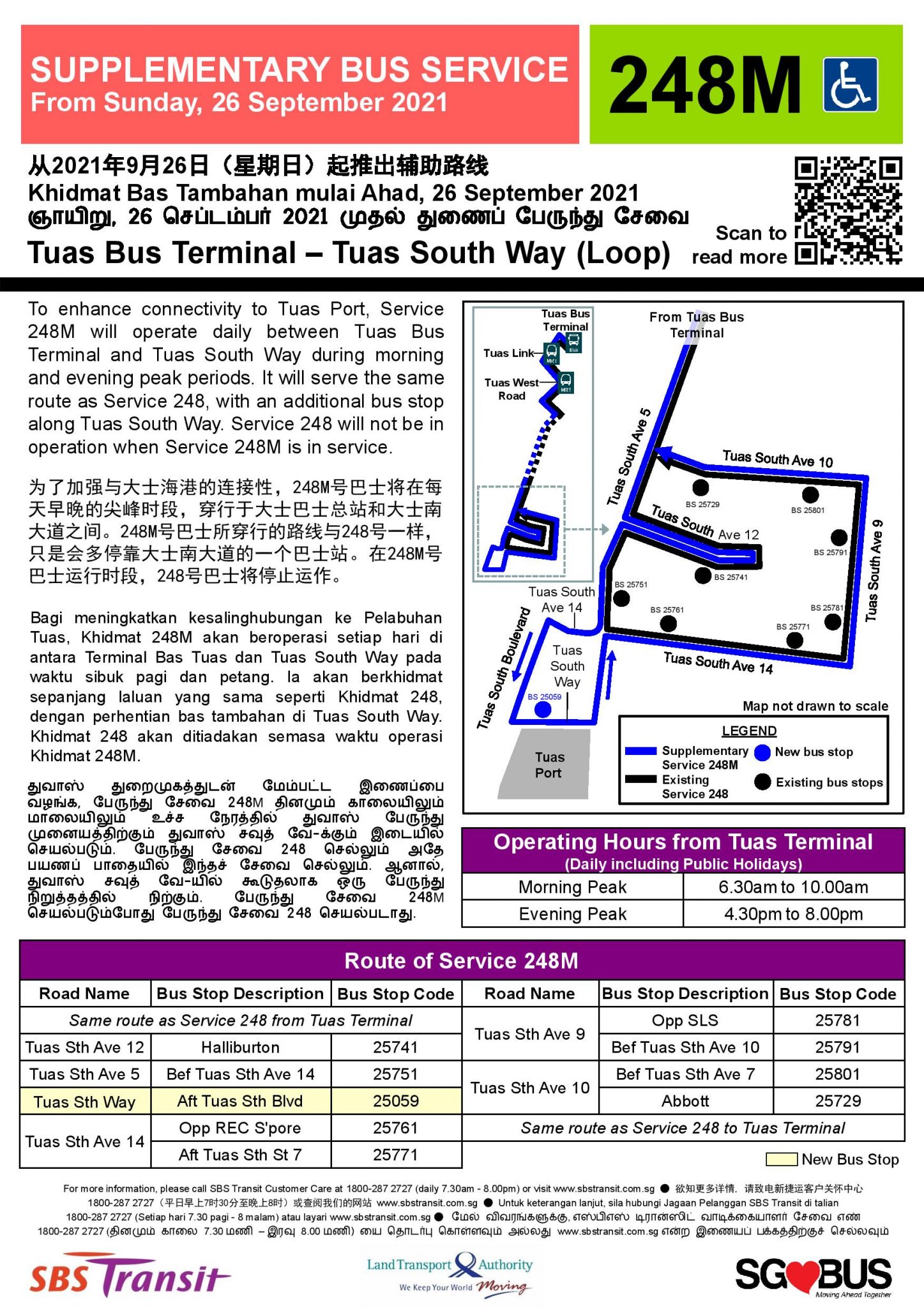 From Sunday, 26 September 2021, SBS Transit Bus Service 248M will be launched to operate daily during morning & evening peak hours, serving an additional bus stop along Tuas South Way. Service 248 will not be in operations when Service 248M is in operation.