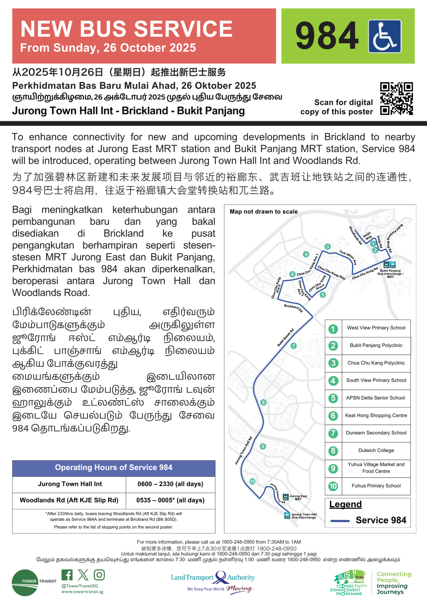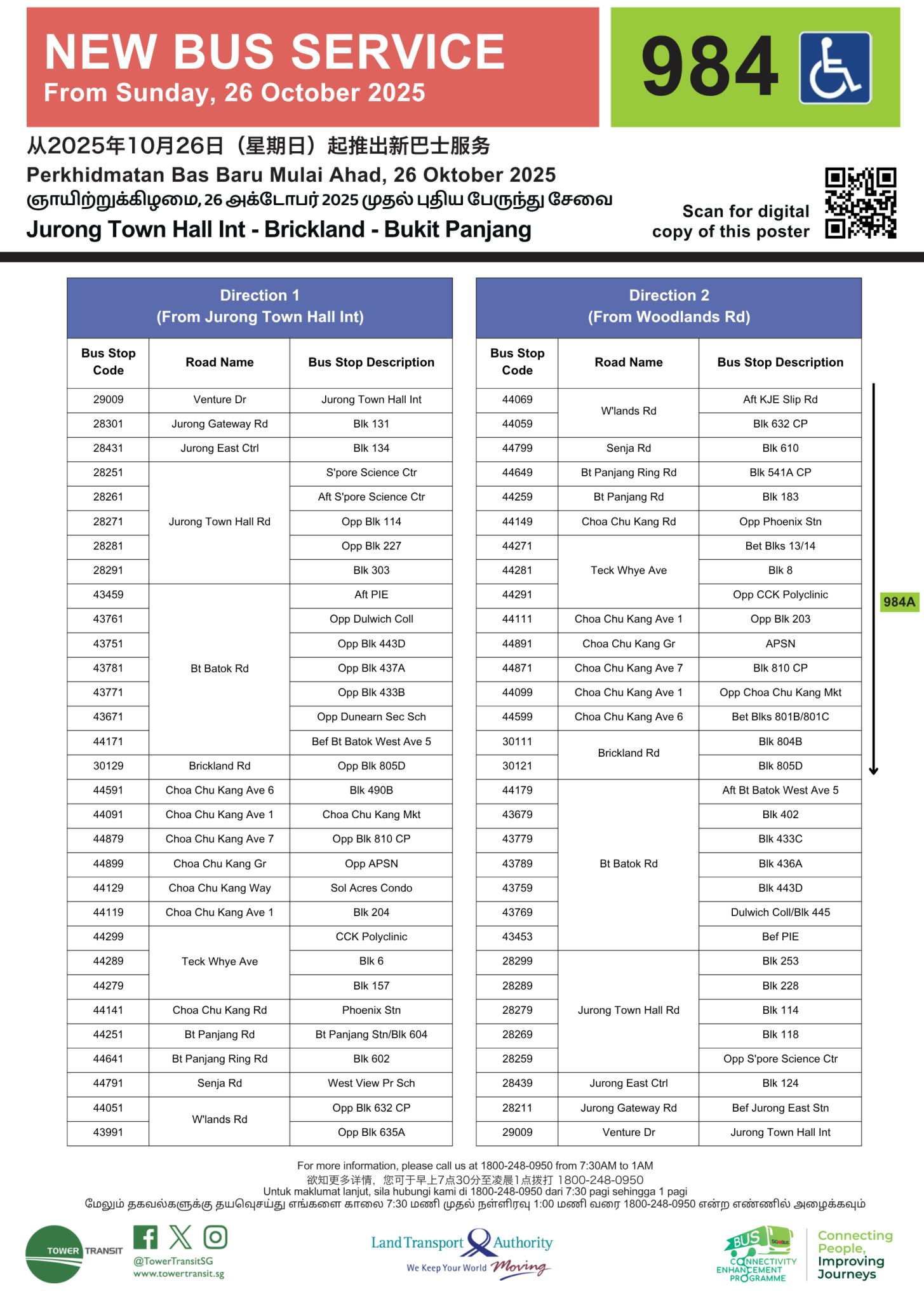 On Sunday, 26 October 2025, new Tower Transit Bus Service 984 will be launched under the Land Transport Authority’s Bus Connectivity Enhancement Programme (BCEP).