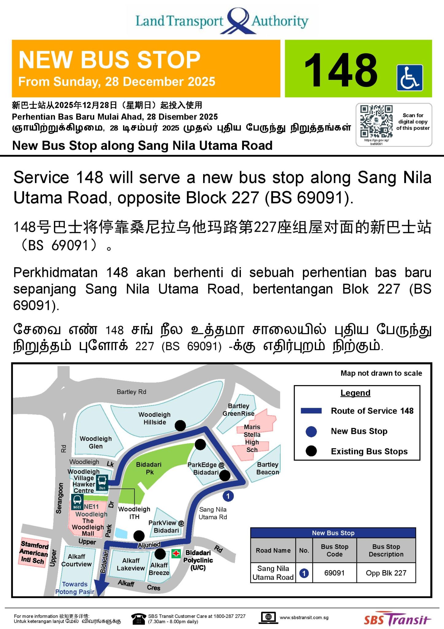 From Sunday, 28 December 2025, SBS Transit Bus Service 148 will serve a new bus stop along Sang Nila Utama Road towards Potong Pasir Avenue 1.