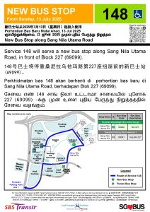 From Sunday, 13 July 2025, SBS Transit Bus Service 148 will serve a new bus stop along Sang Nila Utama Road towards Woodleigh.