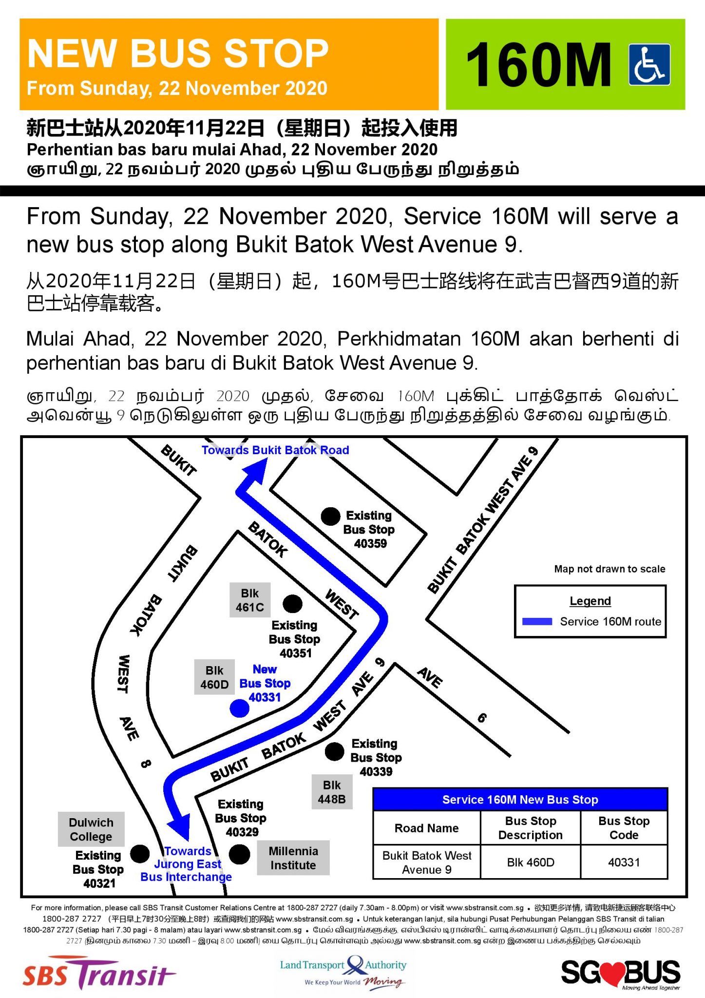 From Sunday, 22 November 2020, SBS Transit Bus Service 160M will call at a new bus stop along Bukit Batok West Avenue 9.