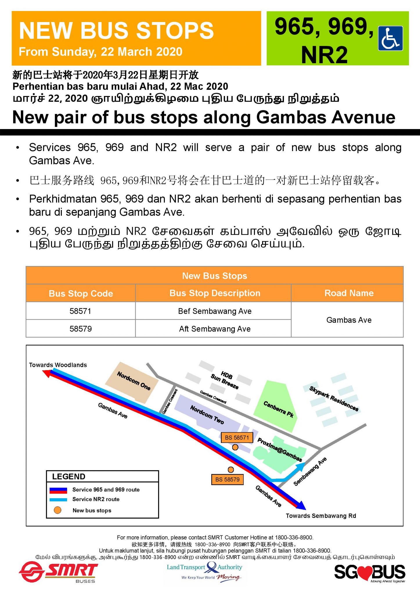 From Sunday, 22 March 2020, SMRT Bus Services 965 & 969 will call at a new pair of bus stops along Gambas Avenue, while Services 965A & NR2 will call at a new bus stop along Gambas Avenue.