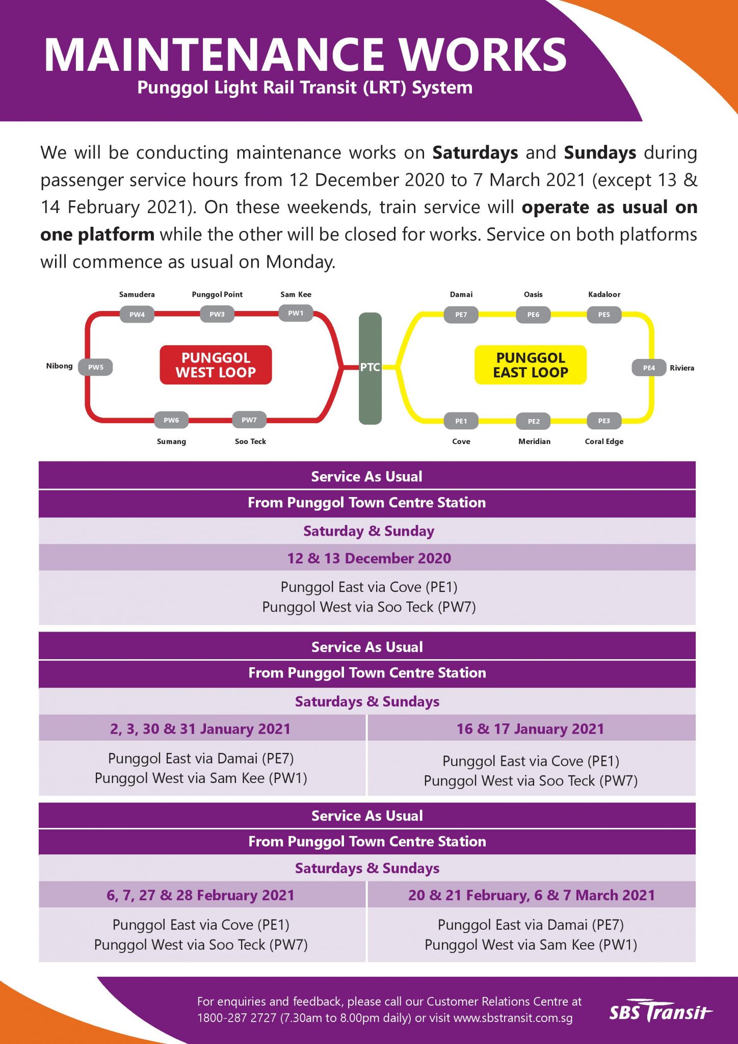 | Maintenance works on Punggol LRT Saturday, 16 January 2021 & Sunday, 17 January 2021 |