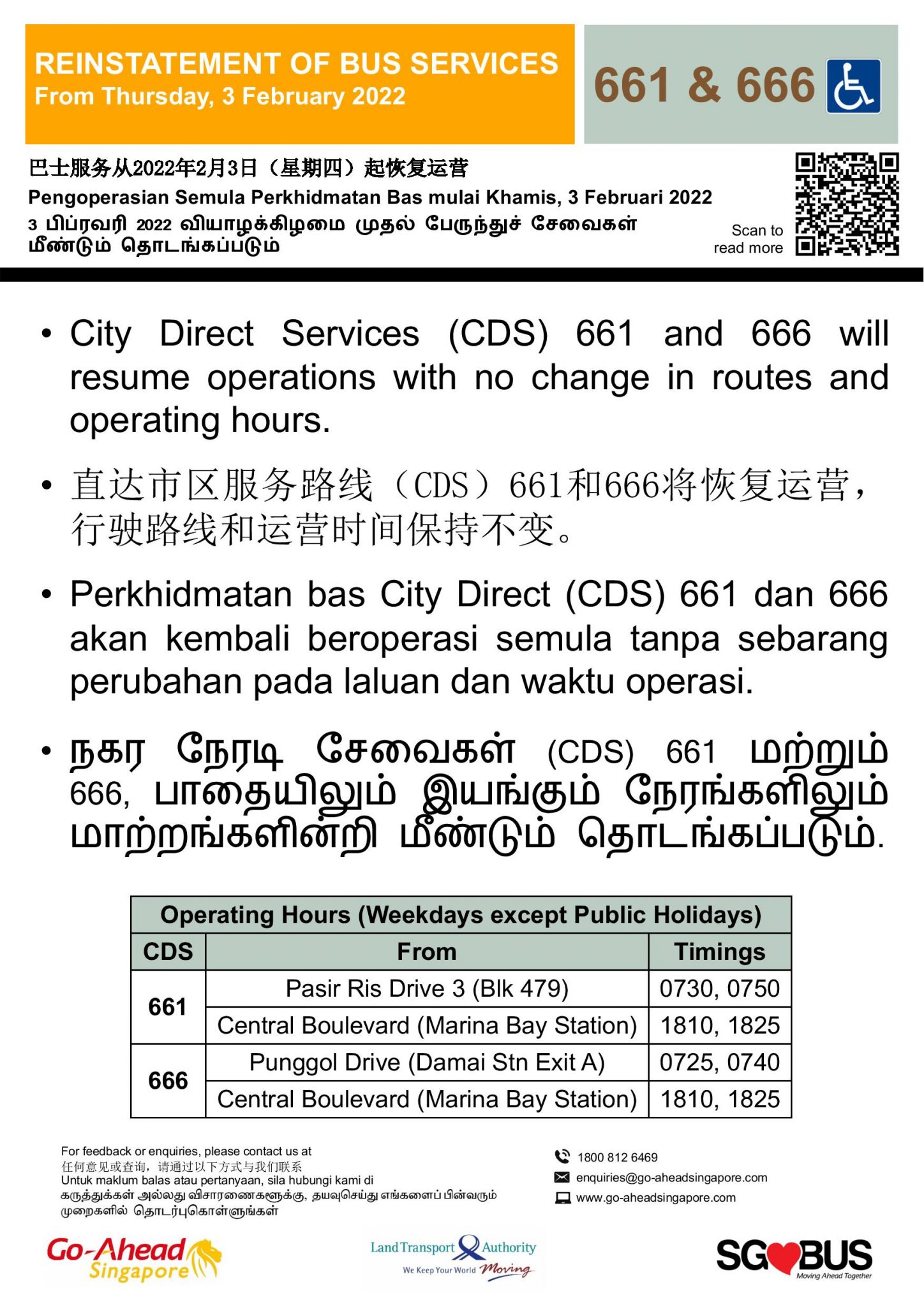 From Thursday, 3 February 2022, City Direct 661 & 666 will be reinstated with no change to its operating hours and frequency.