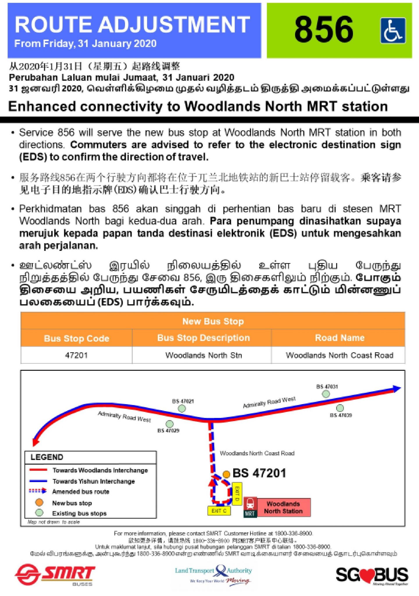 In tandem with the opening of Thomson-East Coast Line 1, SMRT Bus Service 856 will be amended to serve Woodlands North MRT Station both towards Woodlands & Yishun from Friday, 31 January 2020.