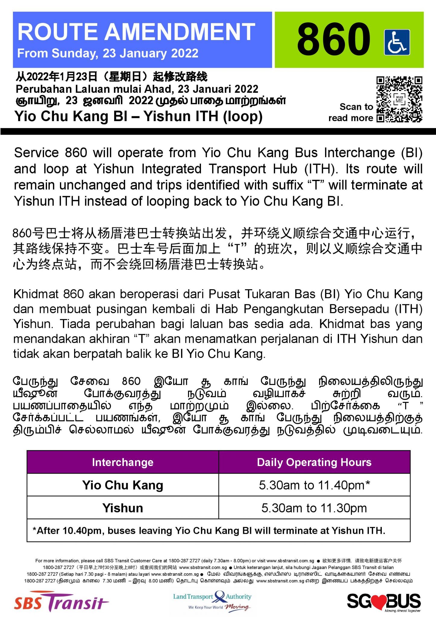 From Sunday, 23 January 2022, SBS Transit Bus Service 860 will be amended to start from Yio Chu Kang Bus Interchange and loop at Yishun Integrated Transport Hub.