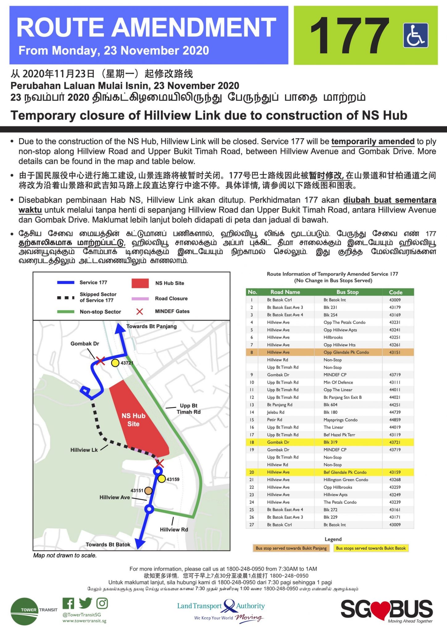 From Monday, 23 November 2020, Tower Transit Bus Service 177 will be temporarily amended to skip Hillview Link due to construction of NS Hub.