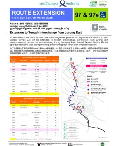 From Sunday 8 March 2026, Tower Transit Bus Services 97 & 97e will be extended to Tengah Int, via Jurong Gateway Rd, Jurong East Ctrl, Jurong Town Hall Rd, Bukit Batok Rd, Tengah Dr & Tengah Blvd under the Land Transport Authority’s Bus Connectivity Enhancement Programme (BCEP).