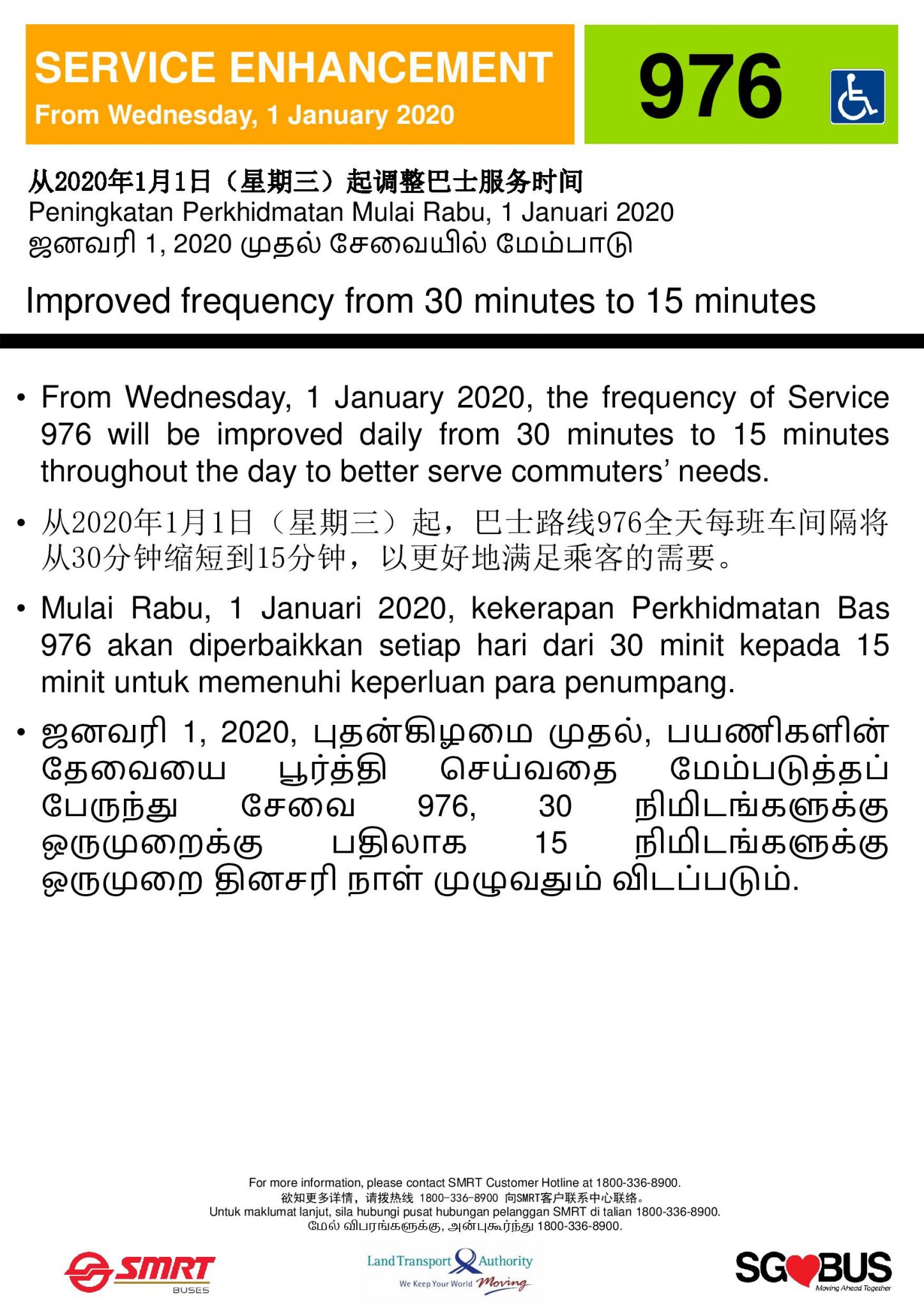 From Wednesday, 1 January 2020, SMRT Bus Service 976 will be enhanced to operate at 15 minutes frequency throughout operating hours. Prior to this, Service 976 was operated at 30 minutes frequency during off peak hours on weekdays, excluding Public Holidays and throughout the day on Weekends & Public Holidays.