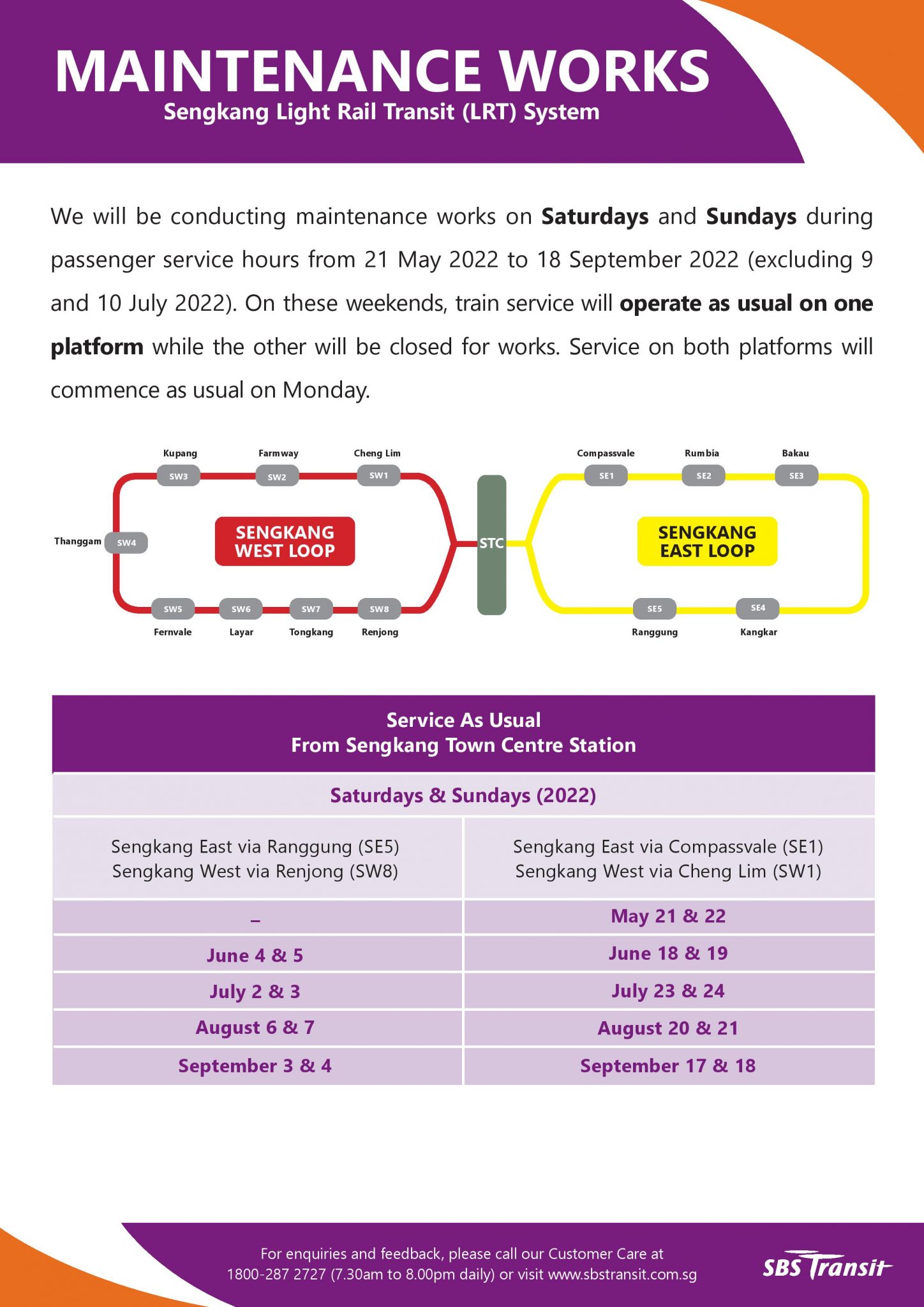 | Maintenance works on Sengkang LRT Saturday, 23 July 2022 & Sunday, 24 July 2022 |