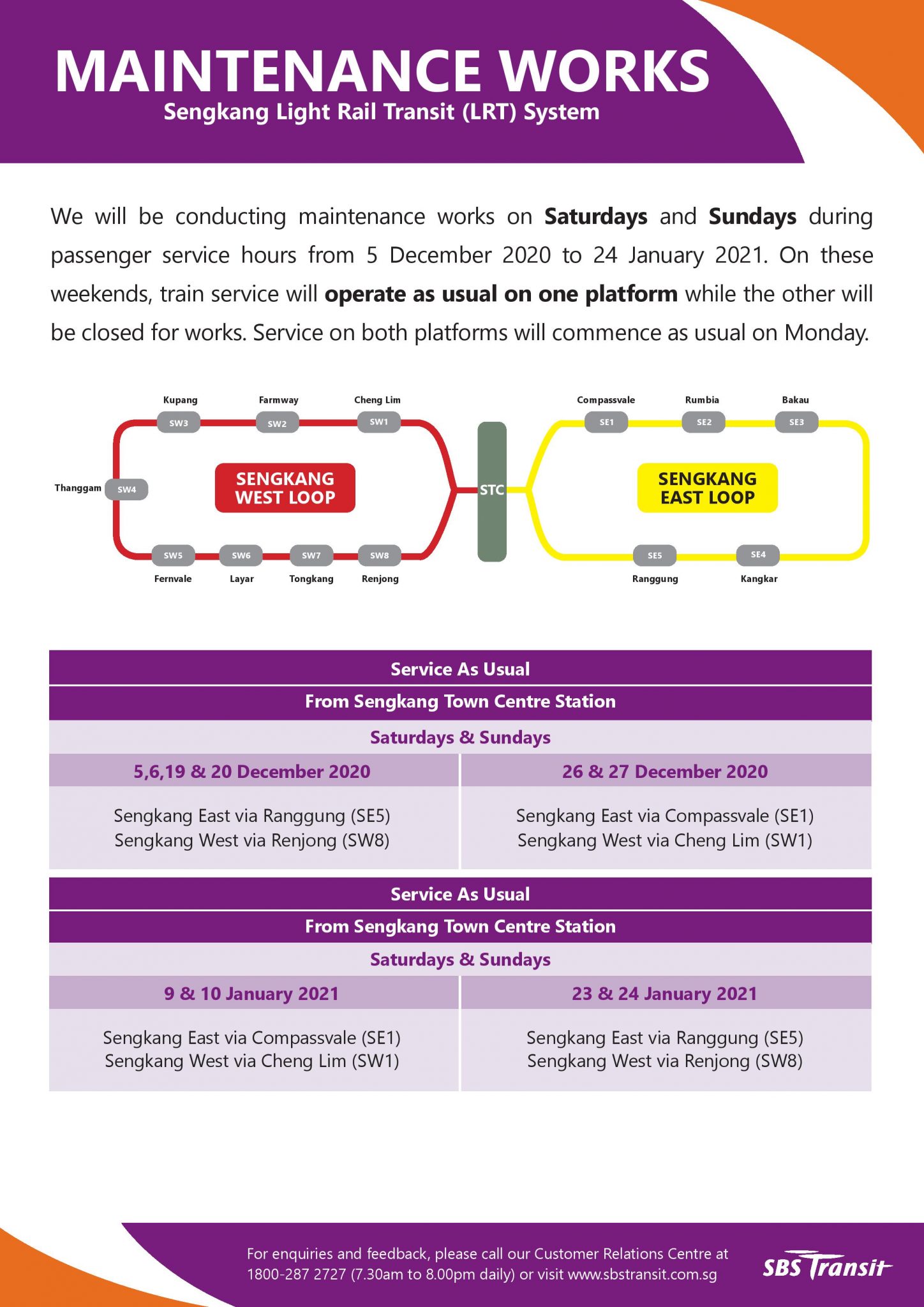 | Maintenance works on Sengkang LRT Saturday, 19 December 2020 & Sunday, 20 December 2020 |