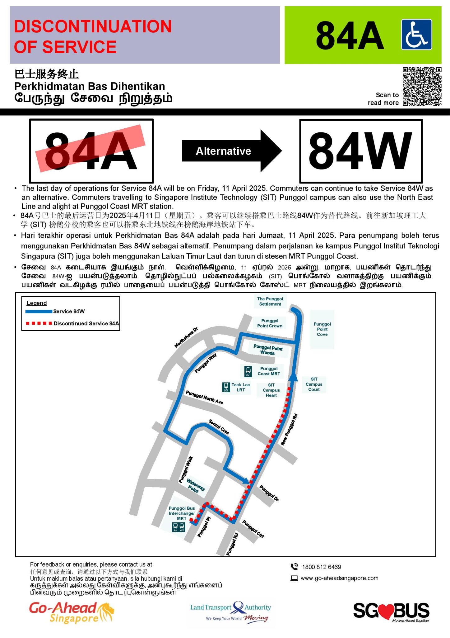 Go-Ahead Short Trip Service 84A from Punggol Temp Int to New Punggol Road (Punggol Coast Stn) will be withdrawn after 11 April 2025.