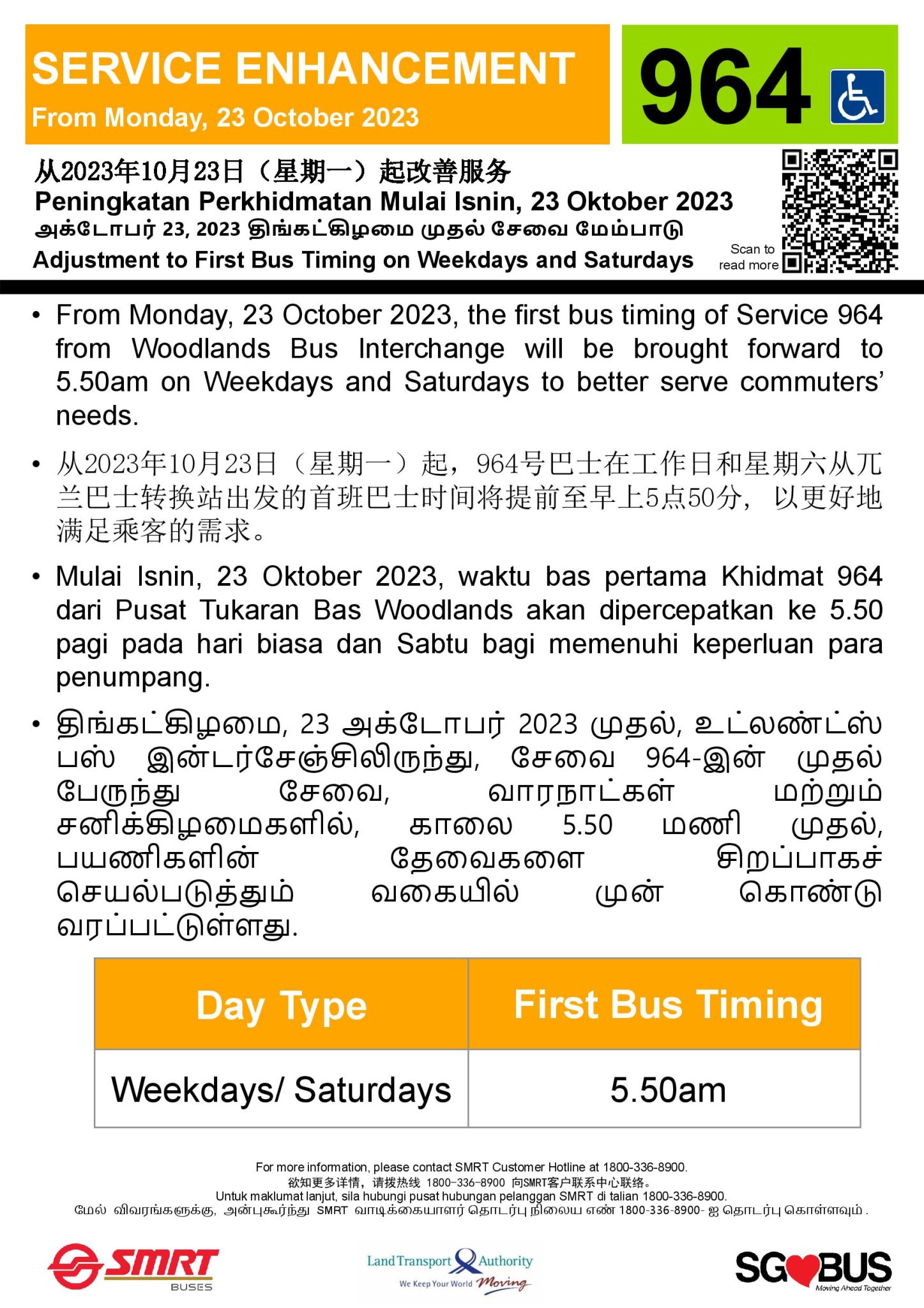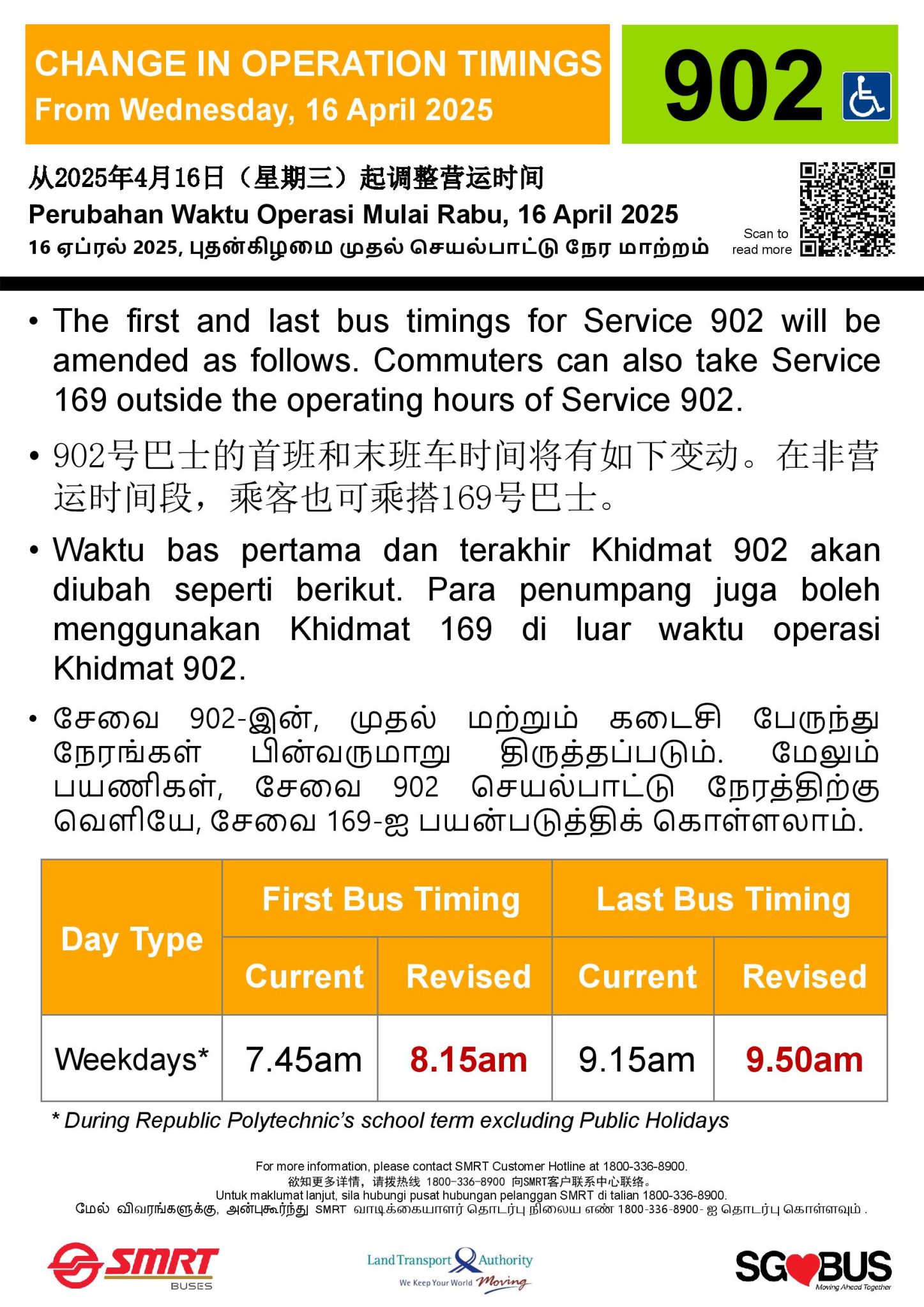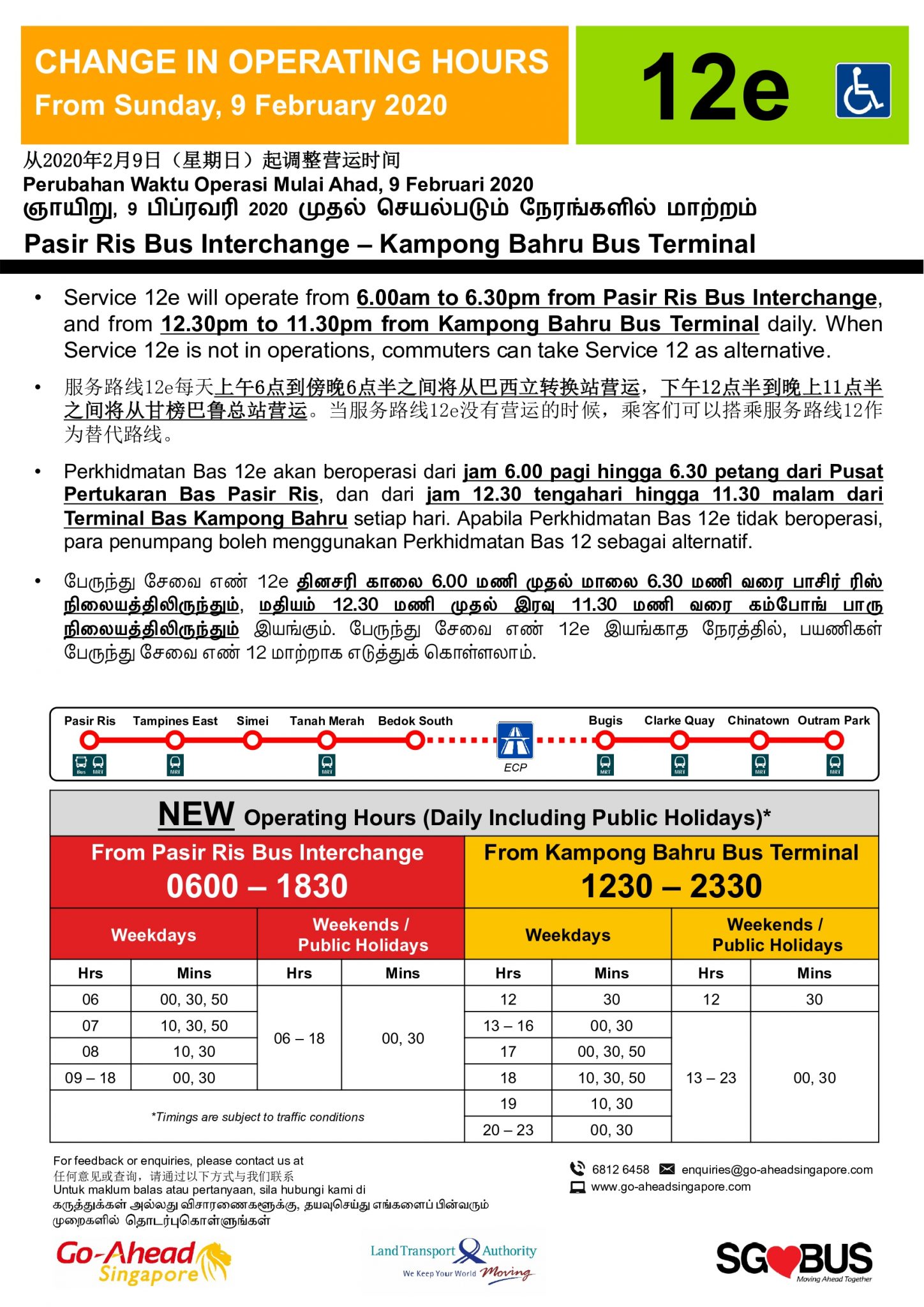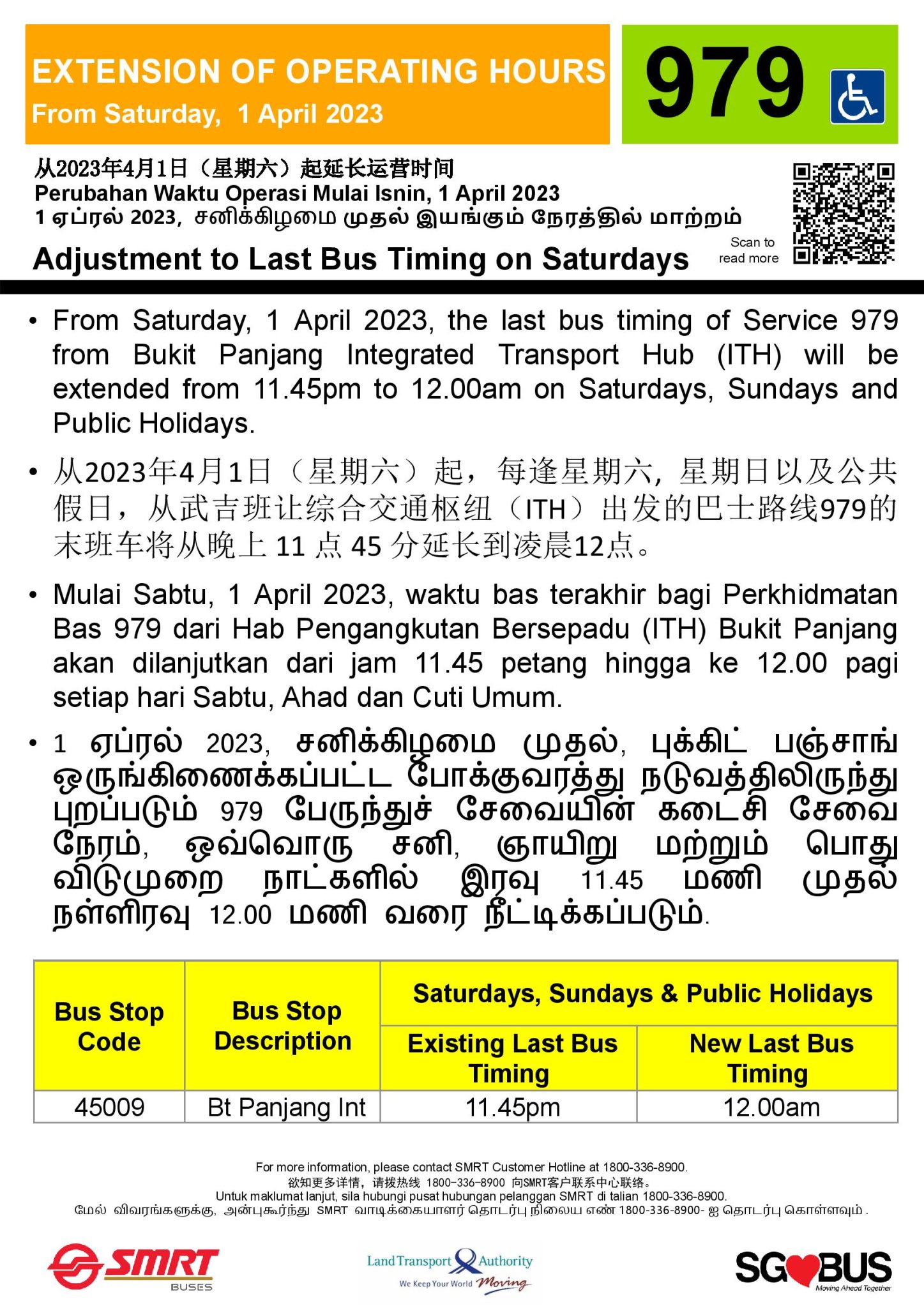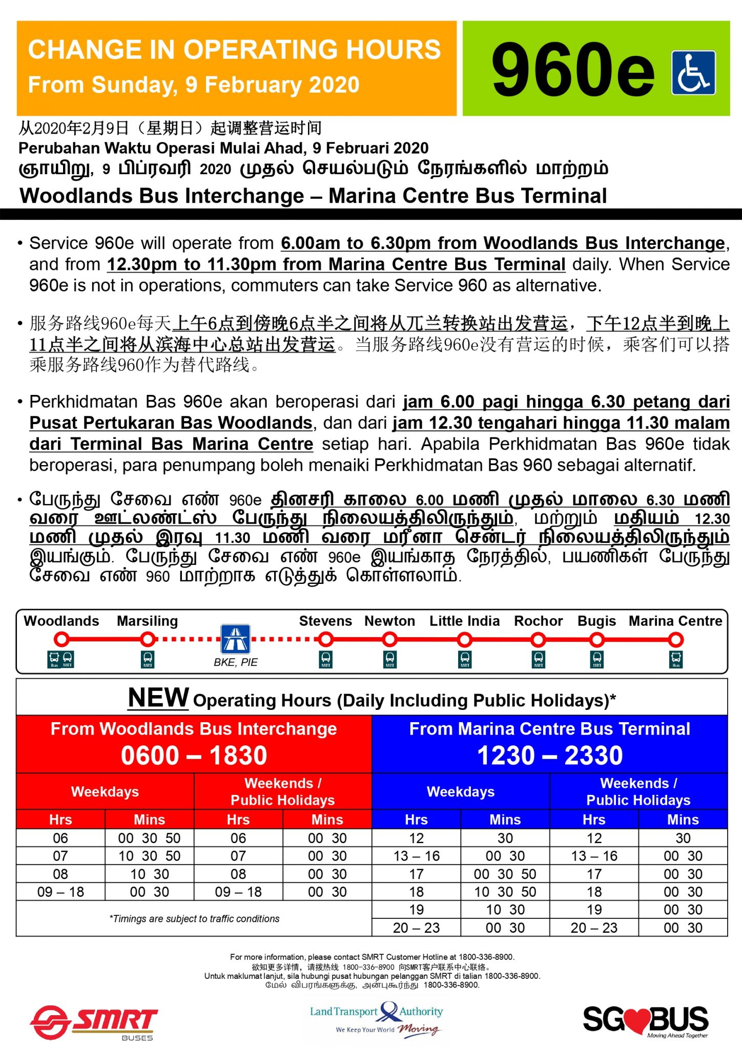 - Bt Panjang Temp Bus Pk: 18:40 – 23:30 (Mon-Fri), 13:15 – 23:30 (Sat), 05:55 – 23:30 (Sun/PH)