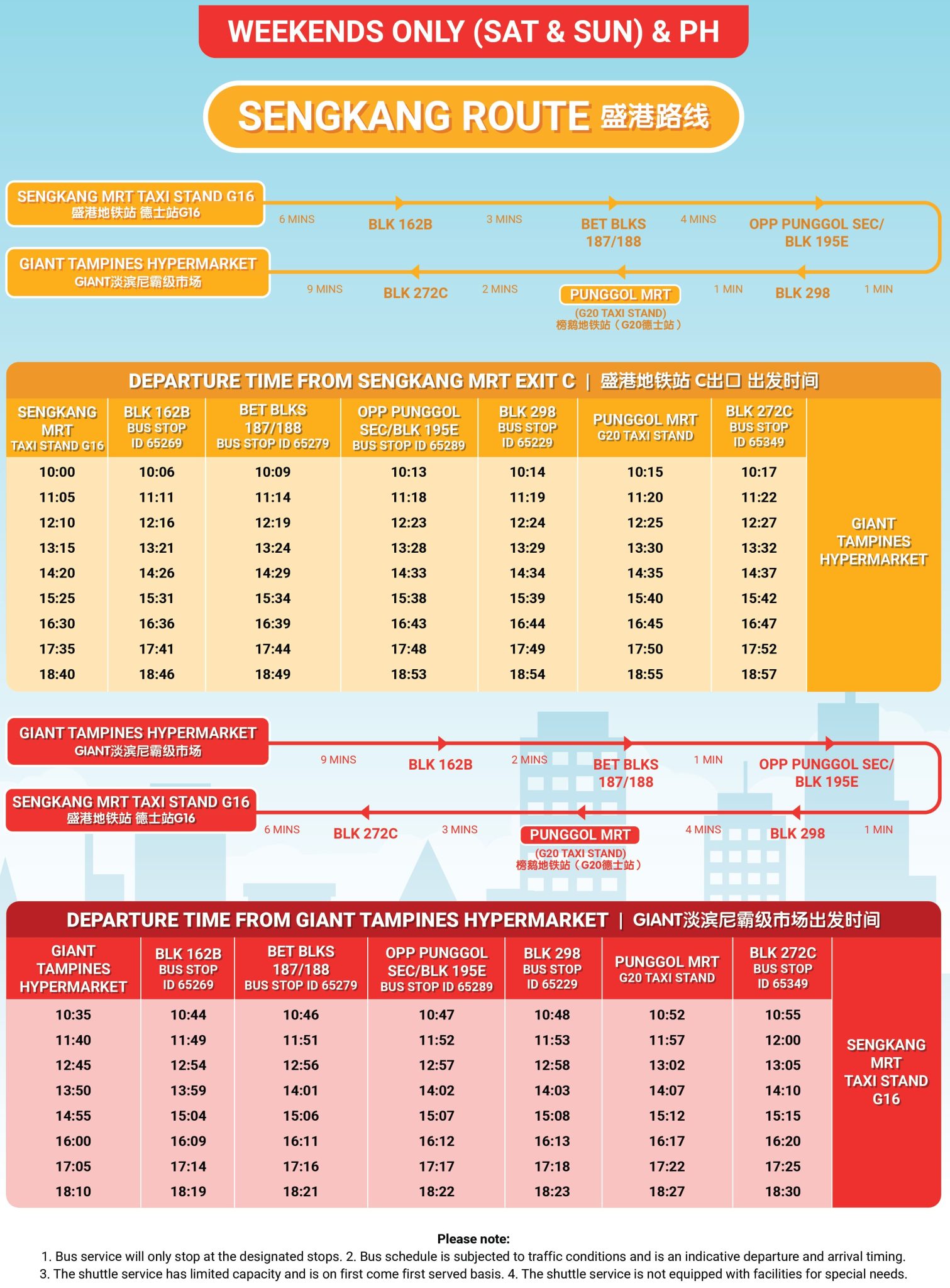 The shuttle service to Sengkang MRT is provided by Giant Hypermarket and operates only on Weekends & Public Holidays.