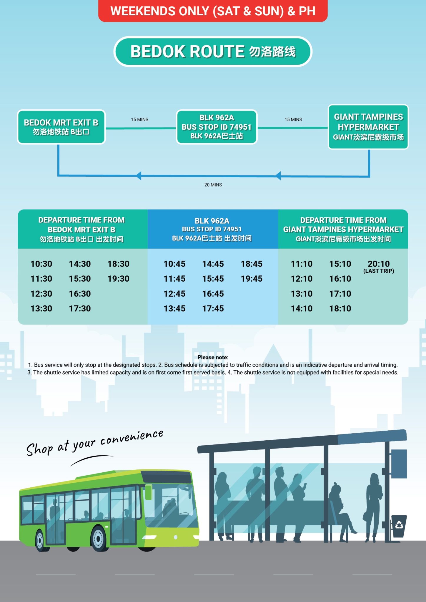 - Shuttle service between Giant and Bedok MRT resumed on Weekends & Public Holidays