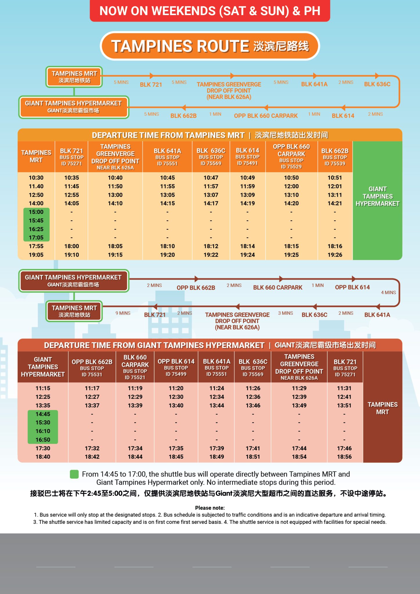The Giant Tampines shuttle service schedule was revised from 6 September 2023, with changes summarised below: