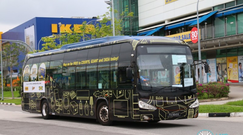 OnΒ 1 April 2021, Courts Megastore decoupled from the Tampines Retail Park shuttle service network, launching its own daily shuttle service to Tampines operated by minibuses. That same day, the shuttle routes were amended to omit Courts Megastore, and Courts was correspondingly removed from the bus’ liveries, initially via removing/covering mentions of Courts. Several months later, buses were re-stickered with an updated livery promoting IKEA and Giant only.