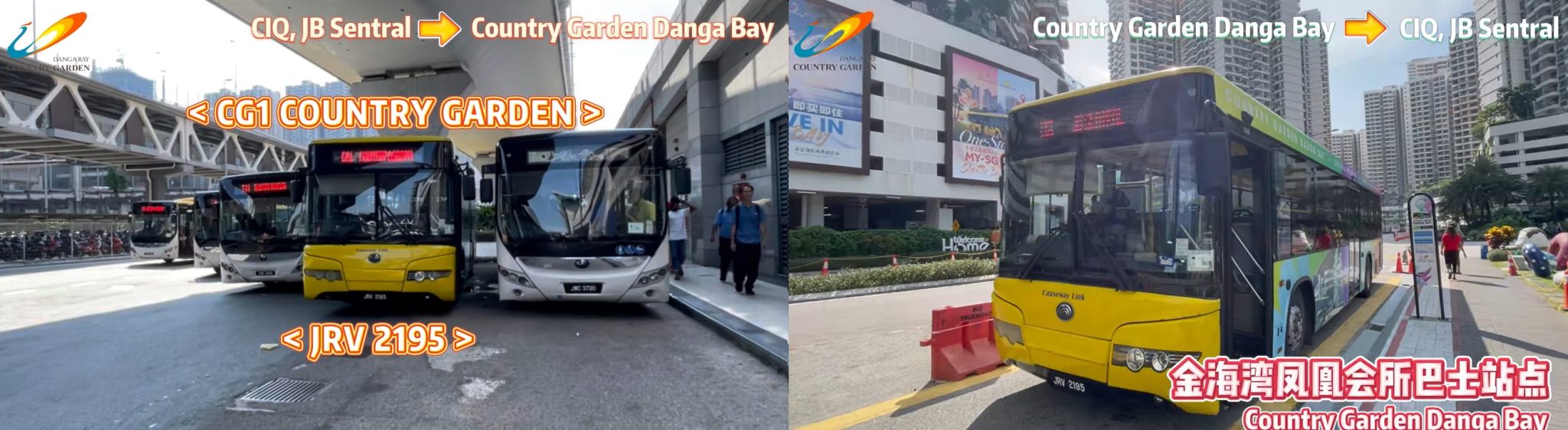 Causeway Link CG1 is a shuttle bus service connecting Country Garden Danga Bay and JB Sentral. with no intermediate stops.