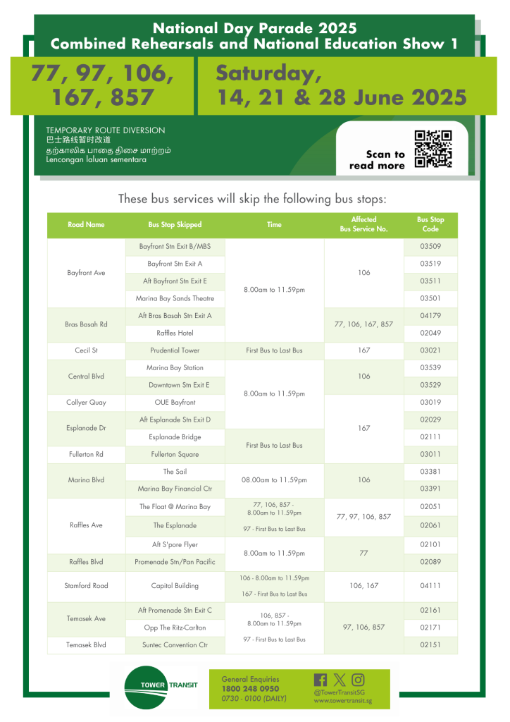 Tower Transit Temporary Route Diversion Poster for NDP 2025 CR 1 & 2 / NE Show 1 Tower Transit Temporary Route Diversion Poster for NDP 2025 CR 1 & 2 / NE Show 1 Tower Transit Temporary Route Diversion Poster for NDP 2025 CR 1 & 2 / NE Show 1