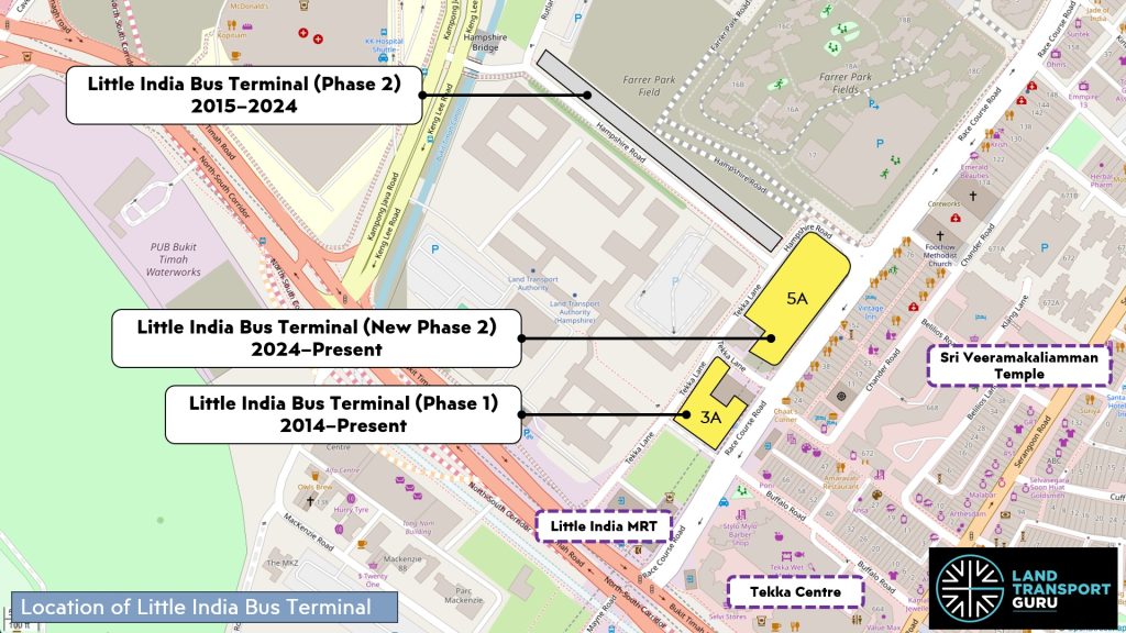 In FY2022/2023, the LTA awarded Contract DE183 — Proposed Bus Facility Works, also to CCECC Singapore Pte Ltd, for the relocation of the Little India Bus Terminal (Phase 2). The redevelopment involved constructing a new terminal north of the existing Tekka Lane (Phase 1) facility, and the demolition of the Hampshire Road facility, to make way for the HDB Farrer Park Fields BTO project and Hampshire Road widening works.