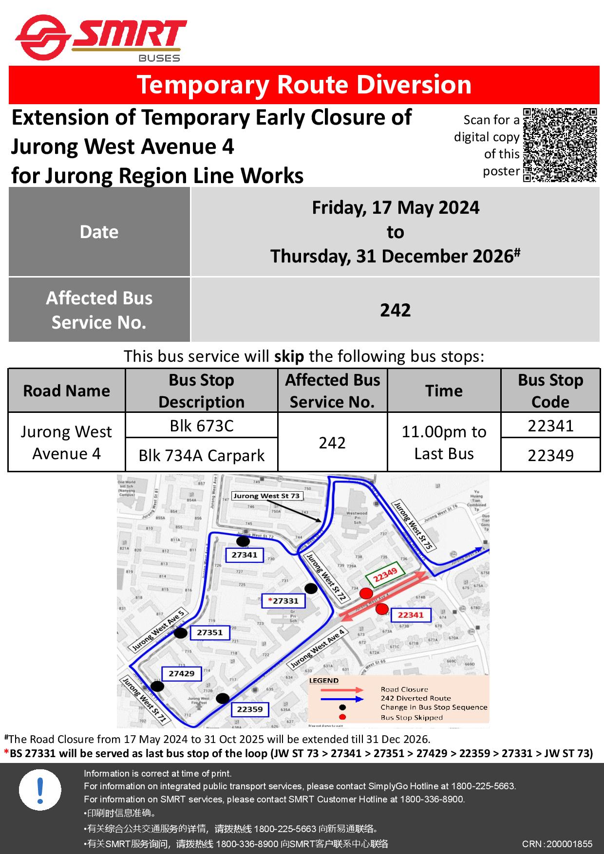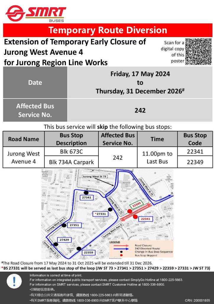 SMRT Buses Poster for Extn of Early Closure of Jur West Ave 4 for JRL Works (Sv 242)