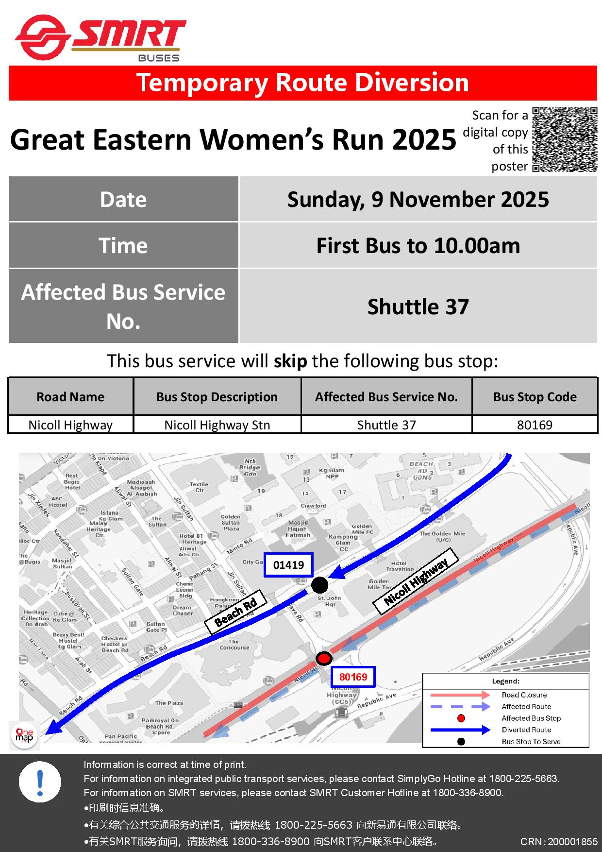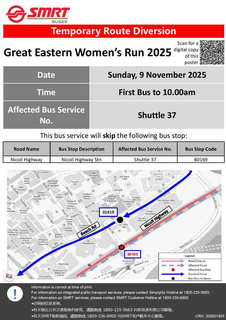 SMRT Buses Temporary Route Diversion Poster for Great Eastern Women’s Run 2025