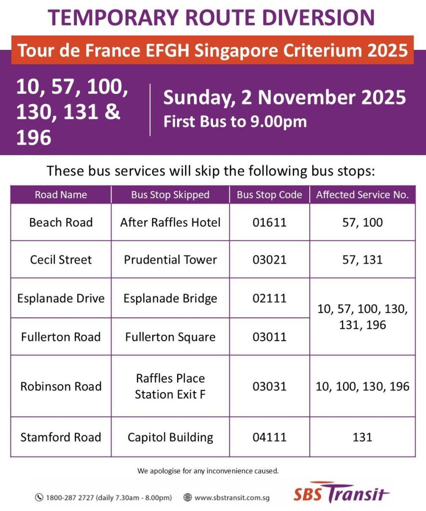 SBS Transit Temporary Route Diversion Poster for Tour de France EFGH Singapore Criterium 2025